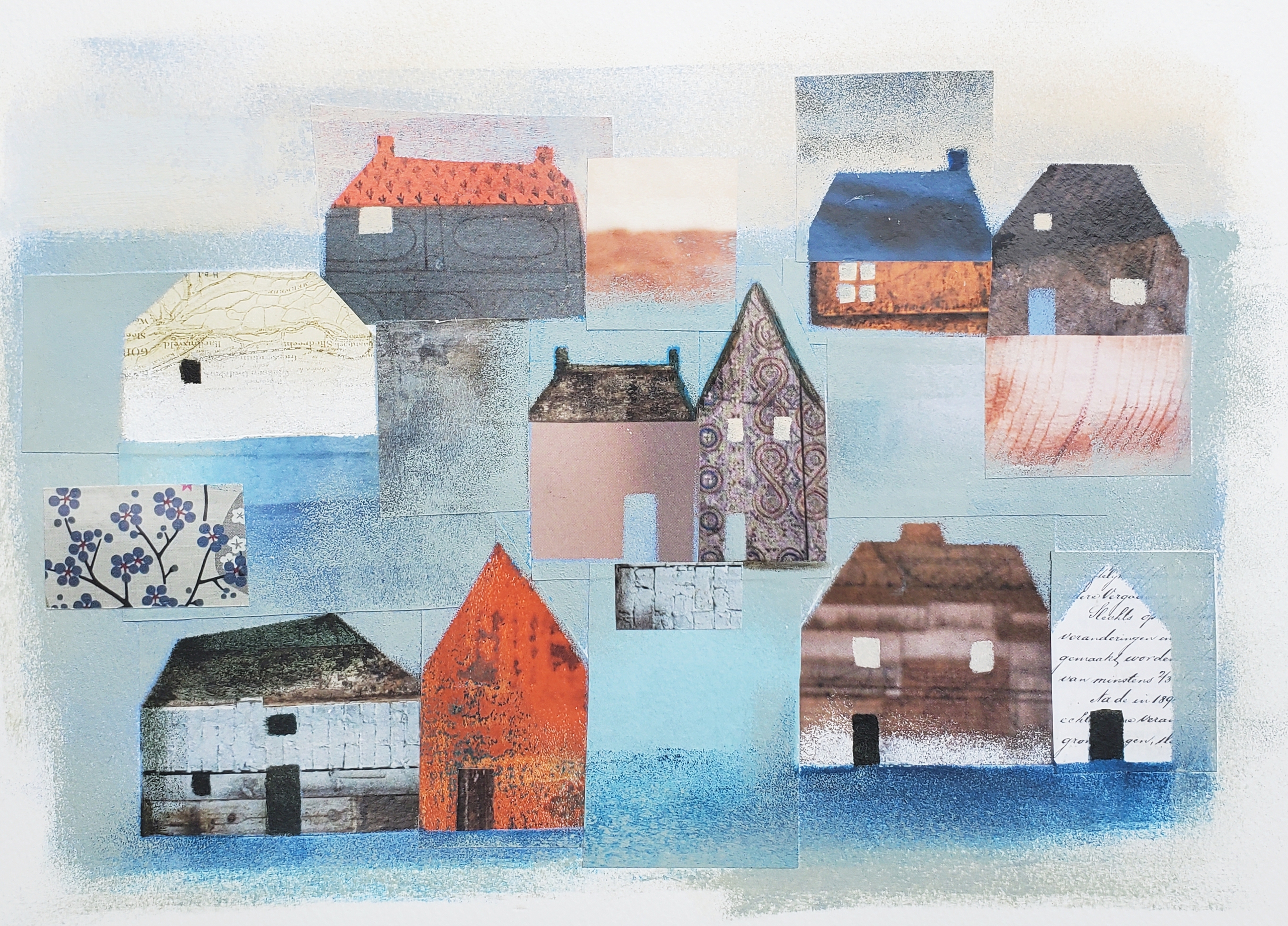 Collage van huisjes van tijdschriftpapier en verf, met blauw en oranje