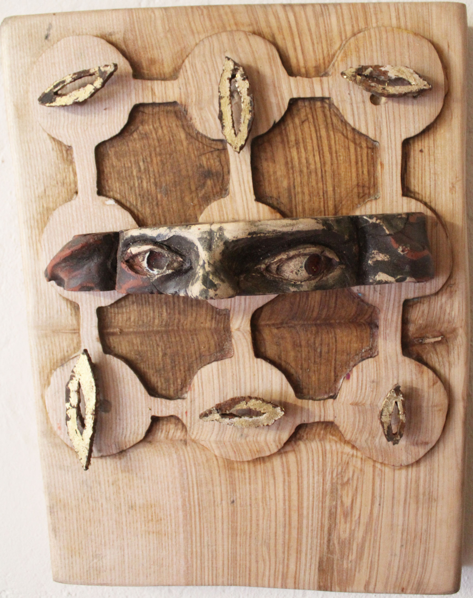 Met dit werk wil ik de fragiele wisselwerking tussen waarheid en bedrog weergeven. De ogen, gebeeldhouwd alsof ze gevangen zitten in het houten raster, zijn zowel waakzaam als kwetsbaar, wat de vraag oproept: observeren ze, of worden ze geobserveerd? De gouden accenten roepen iets kostbaars maar vergankelijks op, een façade die diepere onzekerheden verhult. De ruwe textuur van het hout verankert het werk en vormt een contrast met de illusie van de glanzende vergulde details. Is het een reflectie op vertrouwen en waarneming, of een visuele meditatie over de ruimte tussen realiteit en verbeelding?
