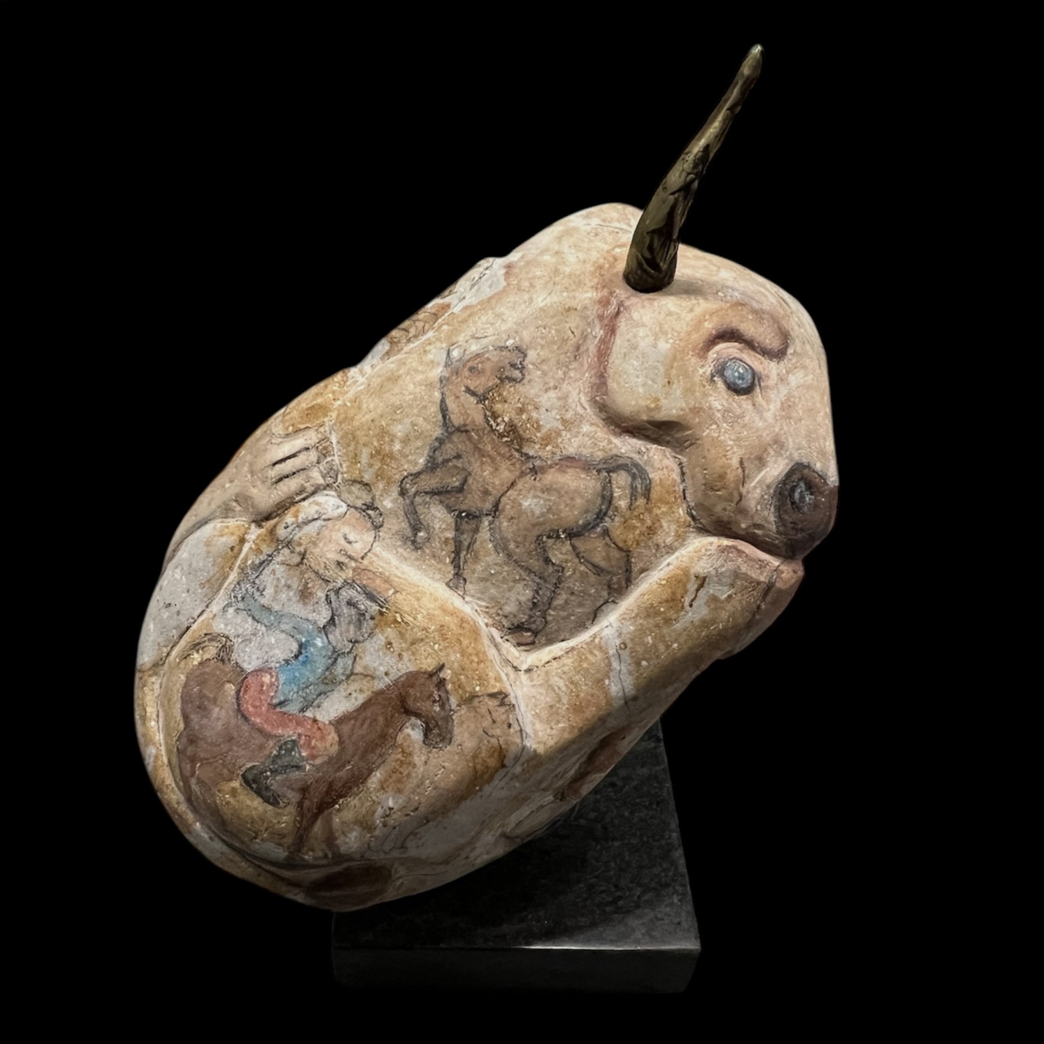 Stier met messing horens, beschilderd. Regenboog zandsteen.
