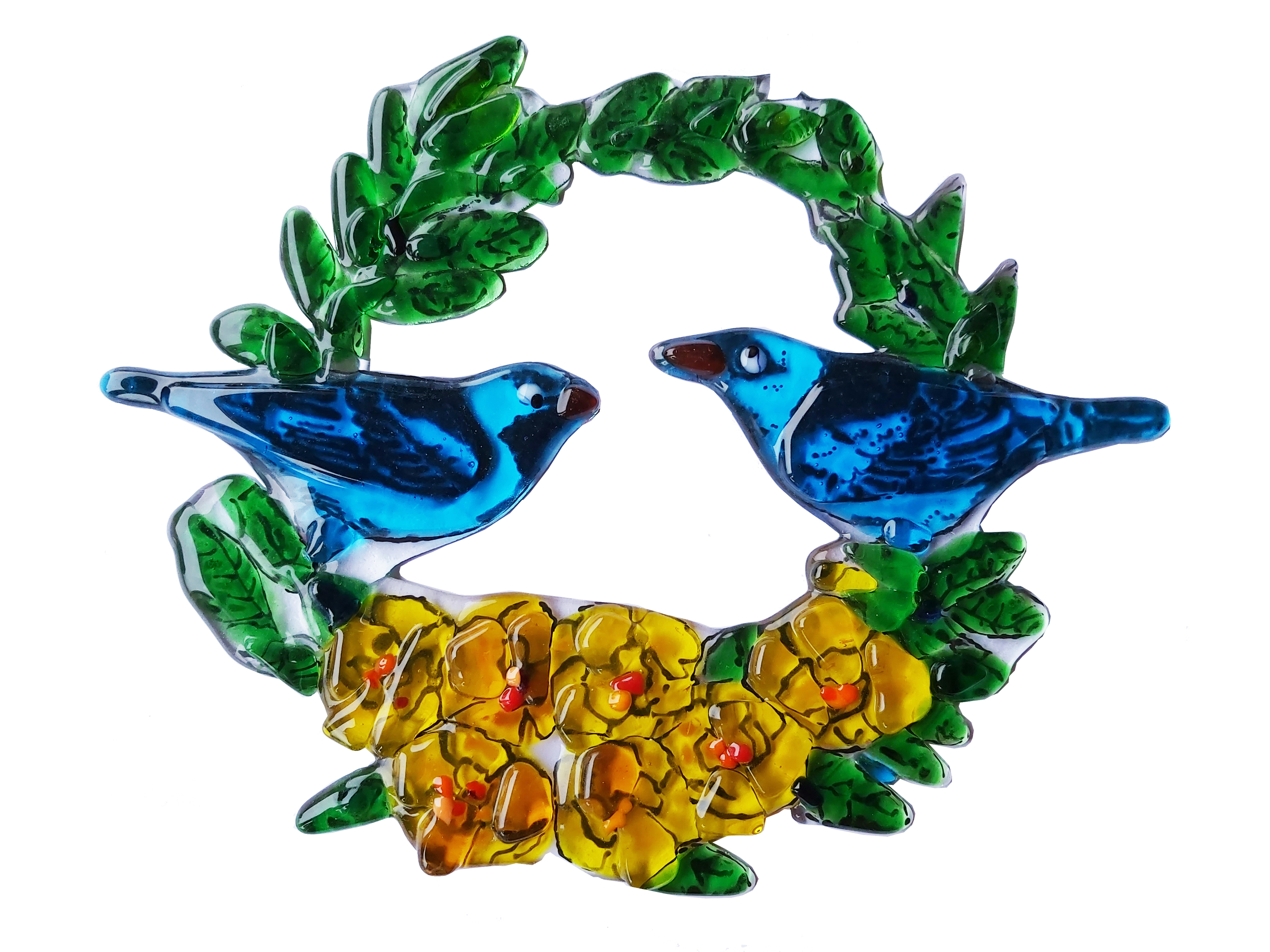 Vogeltjes bouwen een nest, ze willen een nieuw begin, jonge vogeltjes. Het werkstuk is gemaakt van glasfusing.