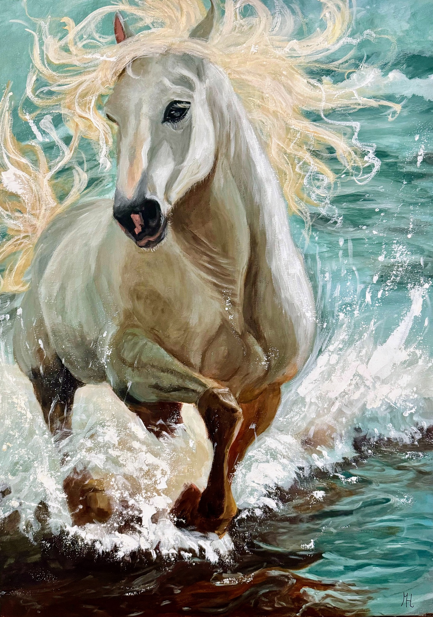 Een krachtig wit paard galoppeert door bruisend water, zijn manen wapperend in de wind en de energie van de zee weerspiegelt in elke beweging. Dit schilderij bevindt zich in Spanje, omgeving Marbella. Woon je daar en heb je interesse? Neem dan contact op.