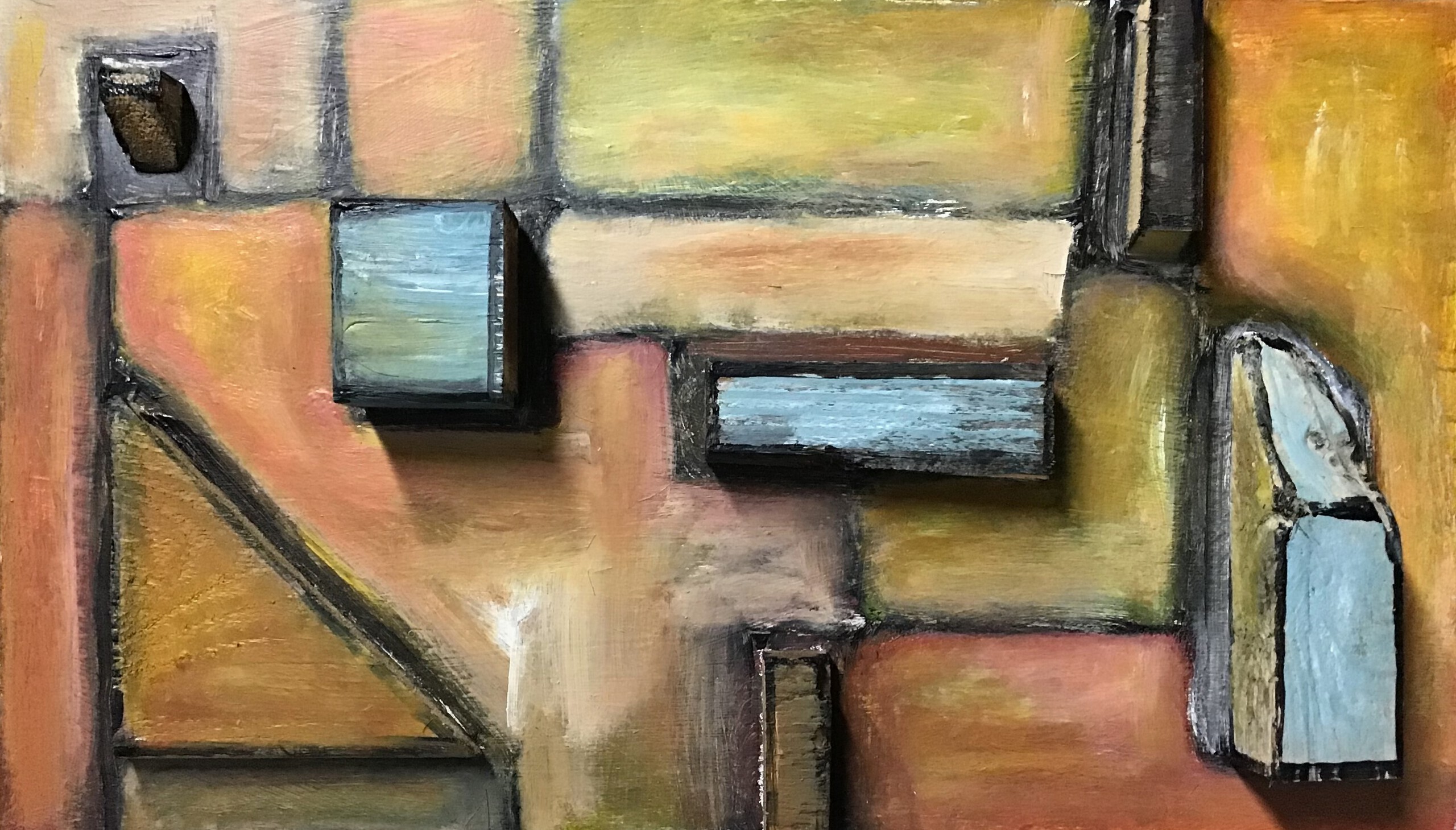 Combinatie van houtcollage en schilderwerk.Formaat 33 x 55 cm.