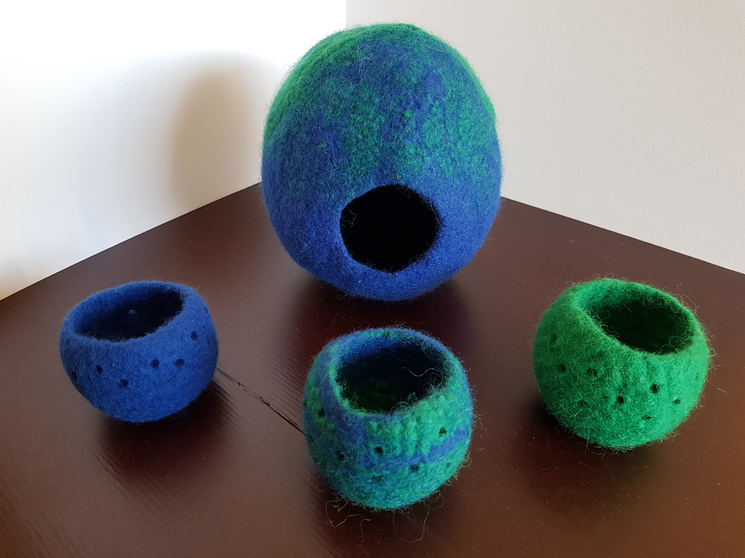 De kleuren groen en blauw zijn hier deels gemengd en staan voor hoop, groei, balans, harmonie en rust. Twee mensen die gedurende het leven meer naar elkaar gegroeid en verweven zijn zonder de eigenheid te verliezen. Het kan samen in het interieur bij elkaar gezet worden, maar ook ieder onderdeel naar een familielid. De grotere lamp kan ook opgehangen worden met ledverlichting erin. In de kleine waxinelichthouders mogen ledlampjes.