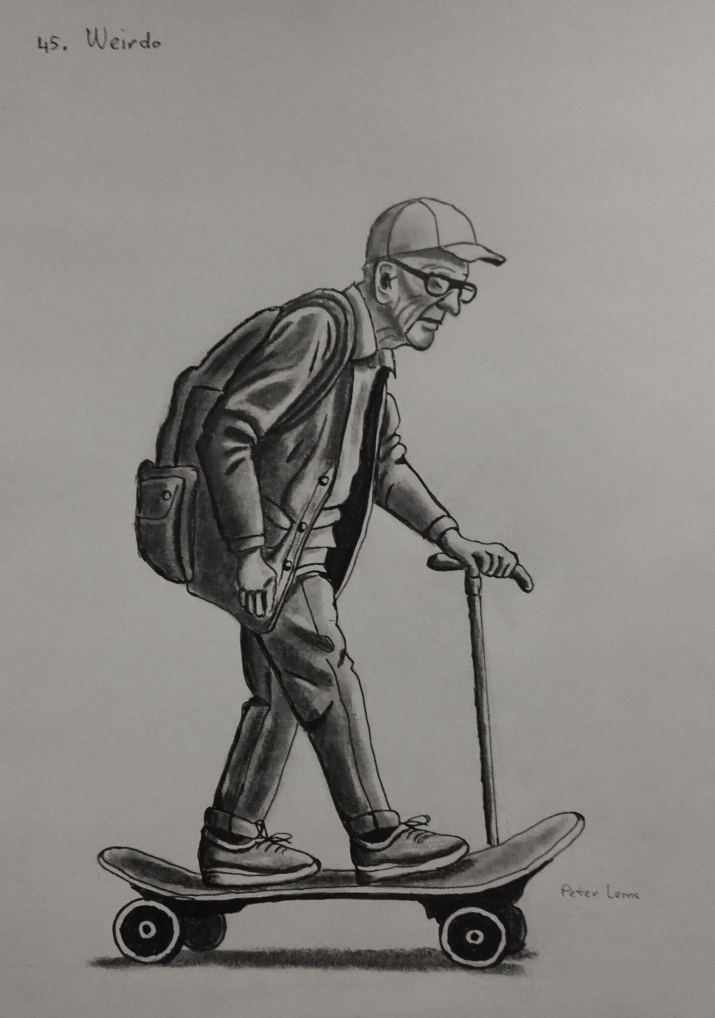 Inktober een vreemde oude man op een skateboard