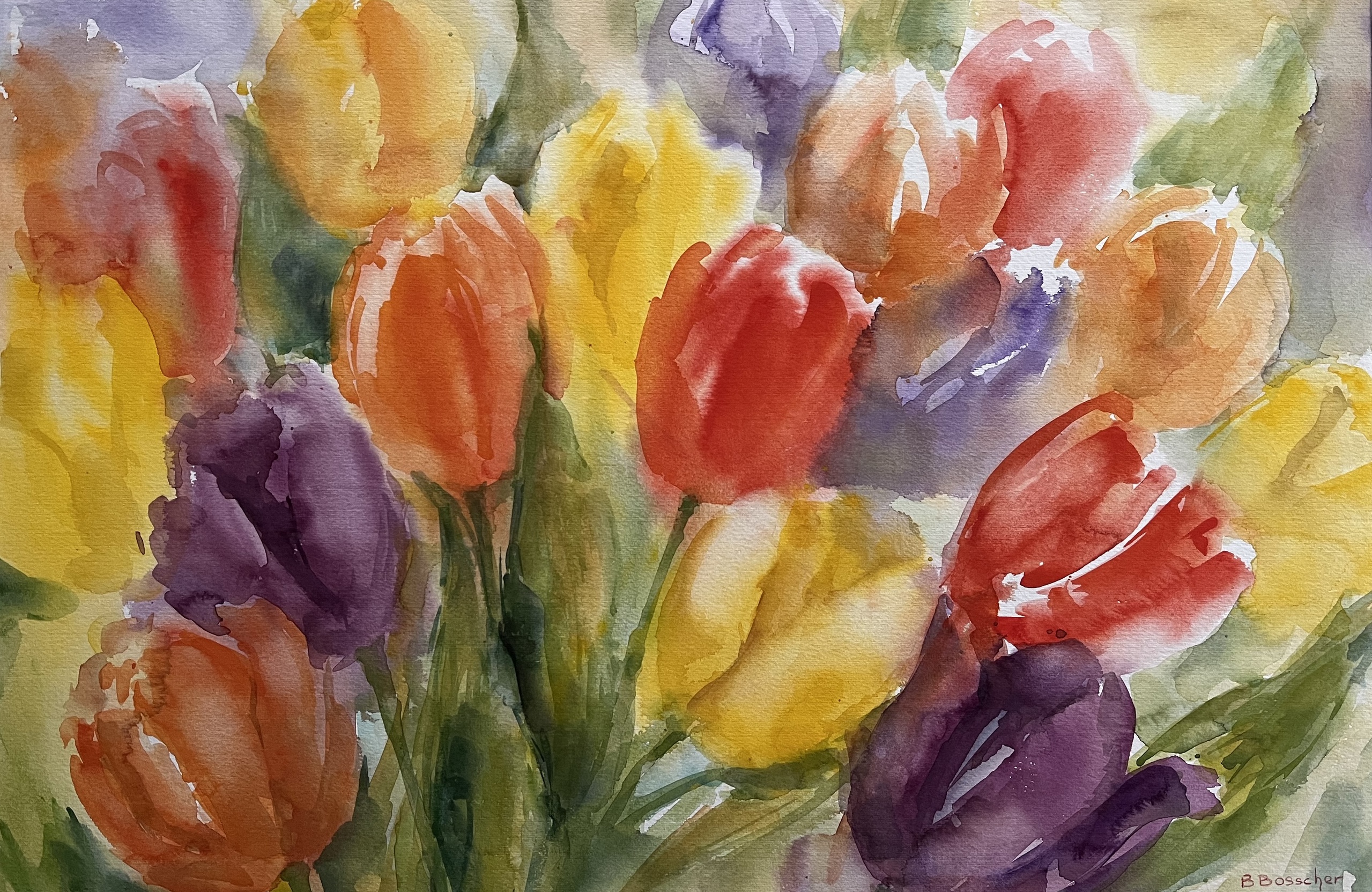 Grote kleurrijke tulpen van de Hollandse velden. De Aquarel zelf is 40 cm hoog-60 cm breed gevat achter een brede passeparout in een wissellijst van 60 cm -80 cm.