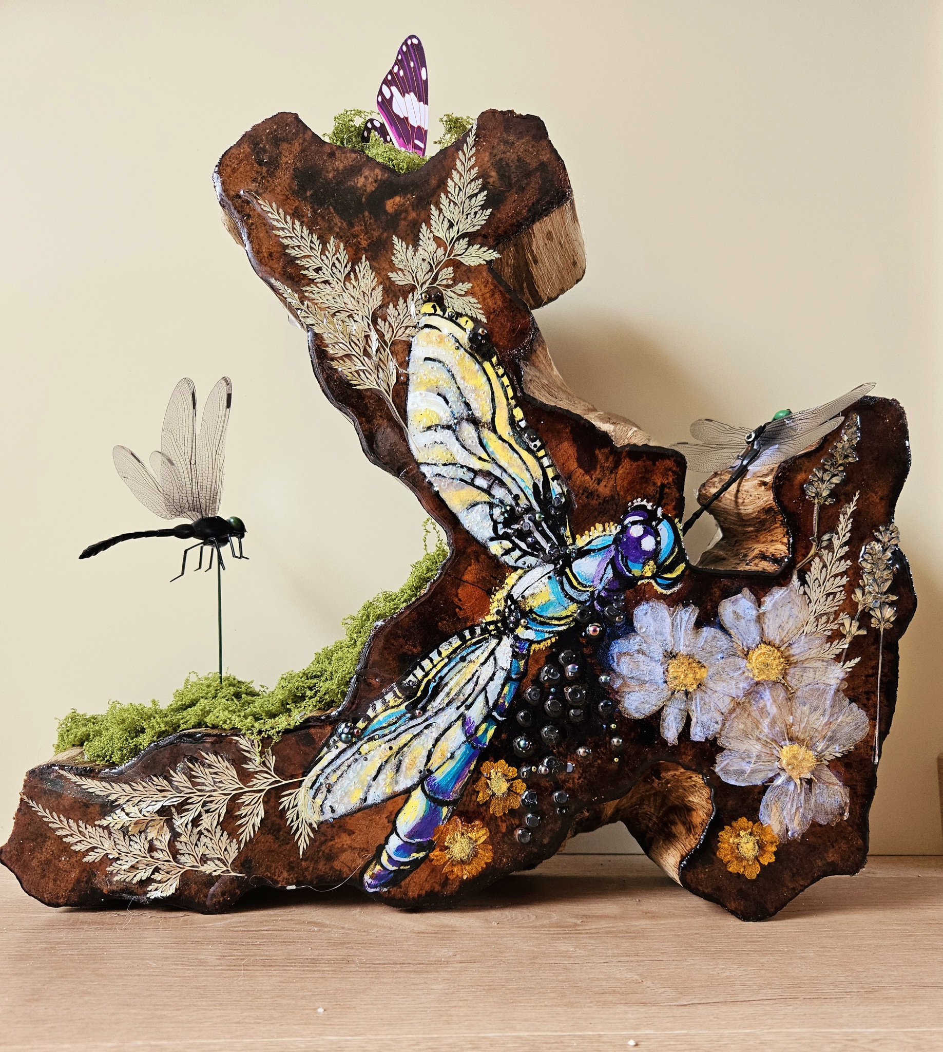Mangrovebeeld De libelle! hand beschilderd met acrylverf en micapoeder. verfraaid met droogbloemen, plantjes, kralen steentjes en libelle's. Bedekt met een prachtige glinsterende laag epoxy