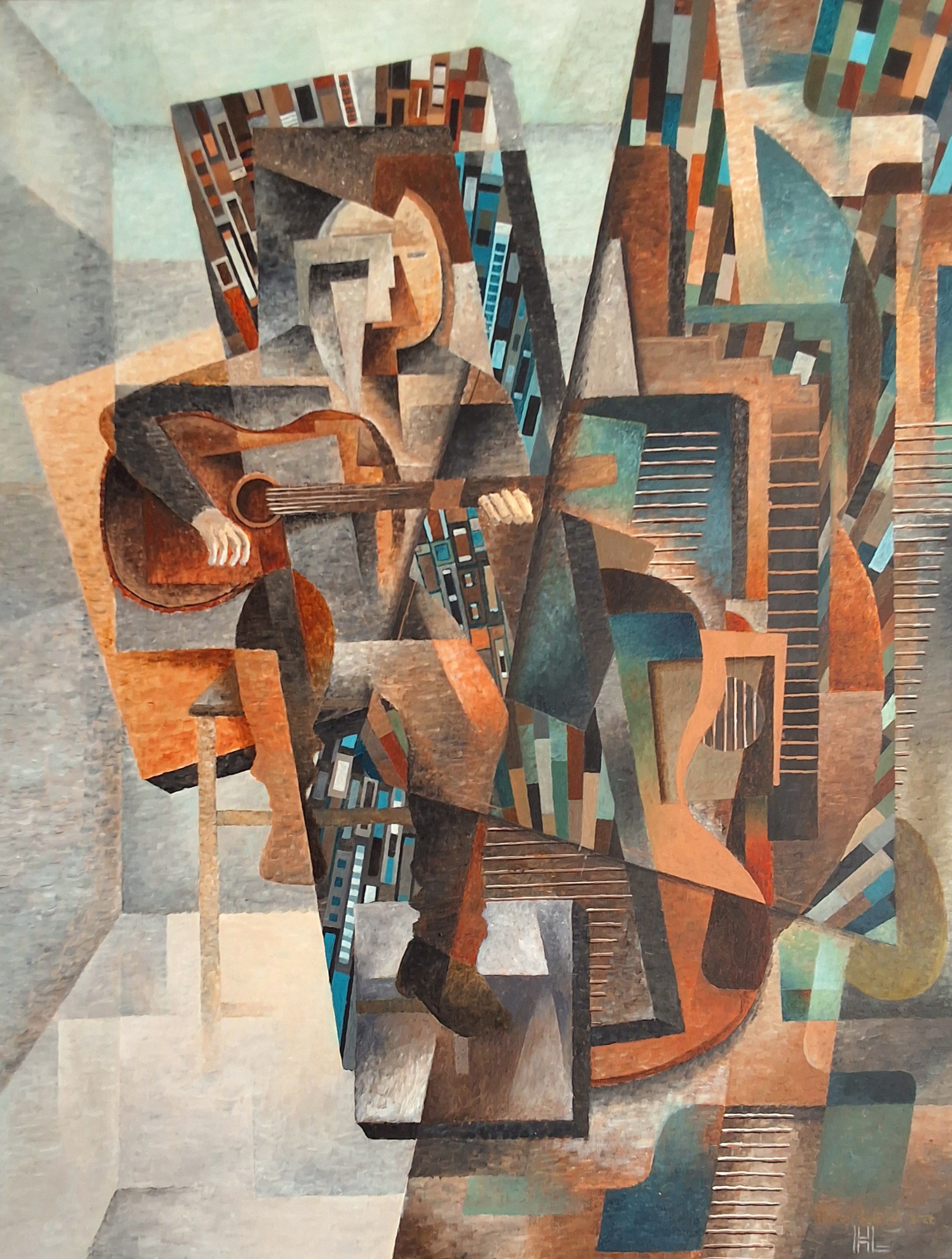 In een spel van twee- en driedimensionale vormen wordt een gitarist weergegeven, gecombineerd met een stilleven van een gestileerde gitaar.