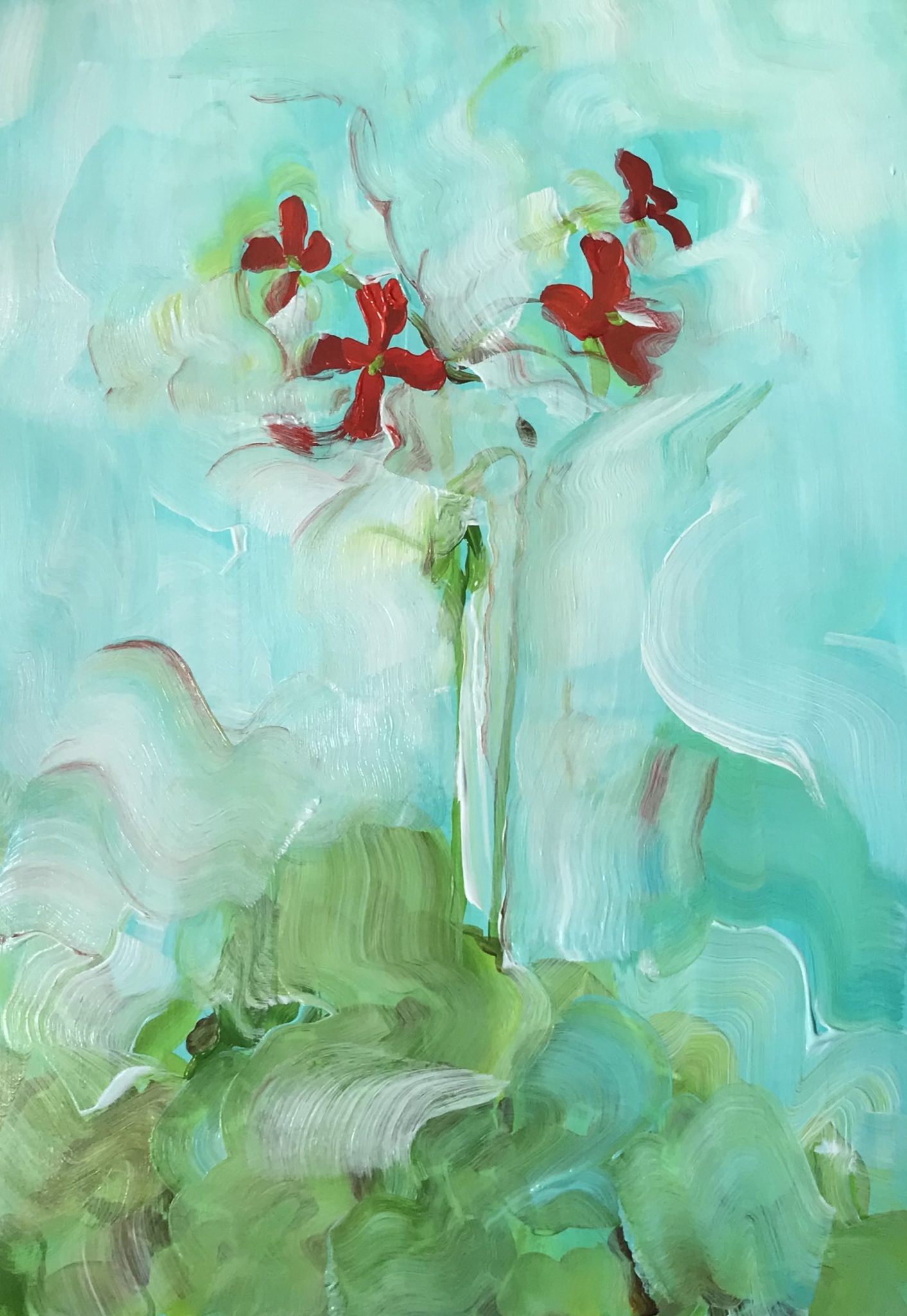 Geranium in de hoofdrol. Het blijft een bijzonder en sierlijk plantje. Op dit werk vervaagt ze wat in de achtergrond, maar ze blijft overeind.