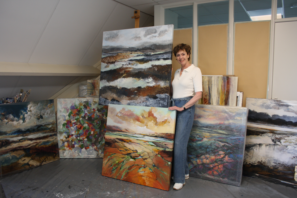 Marly Freij maakt grote kleurrijke, maar ook meer ingetogen schilderijen in gemengde techniek, met name sferische landschappen en abstracte composities