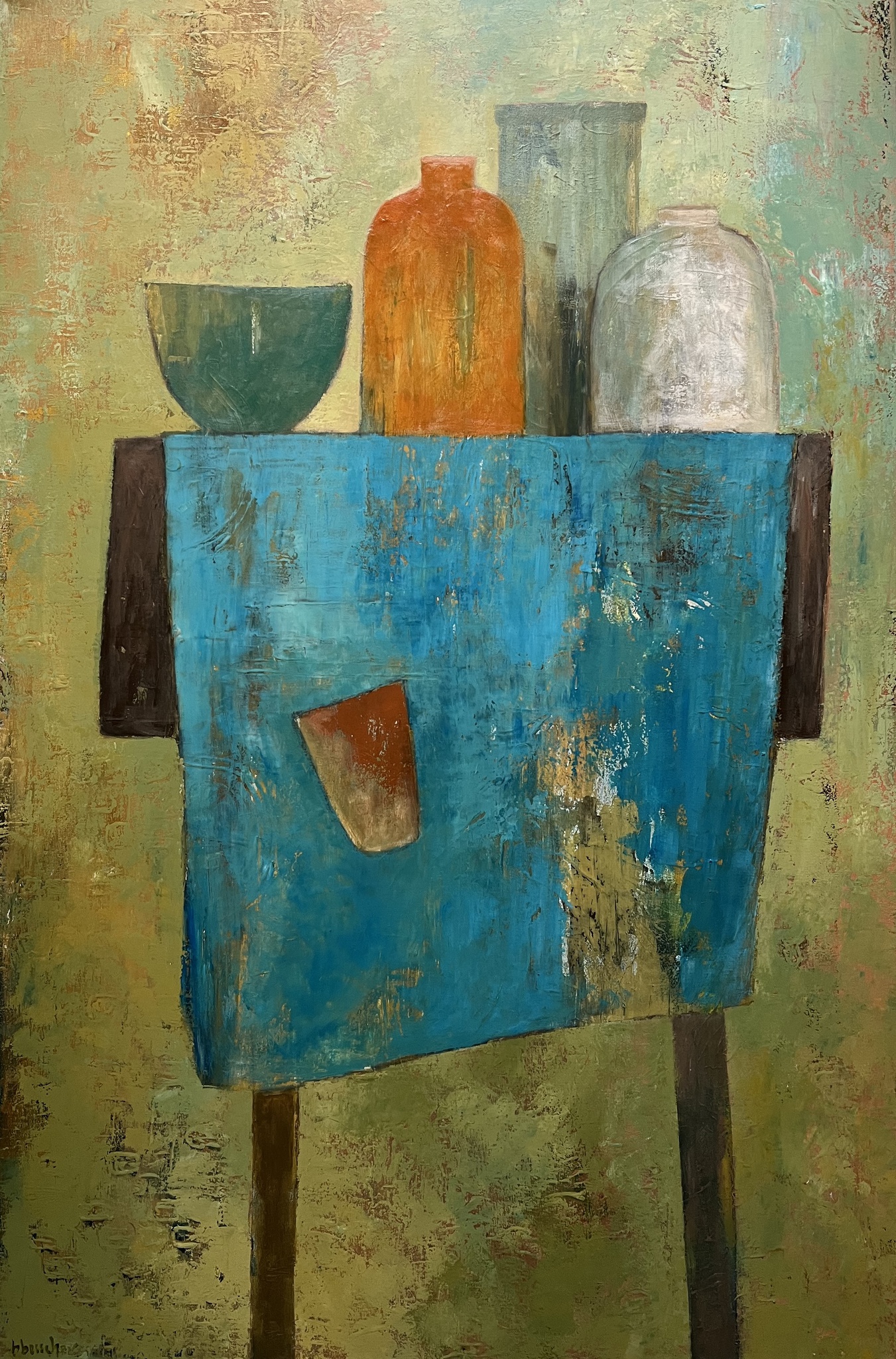 Deze tafel met blauw kleed in contrast met de oranje fles geeft aan dat alles eindig is ,ook een tafelkleed.