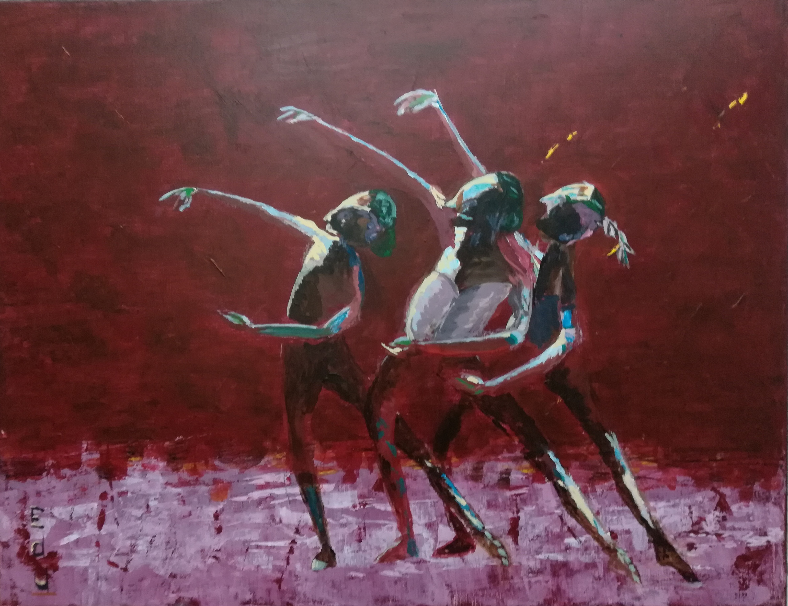 De huidige Edu schildert met waterbased olieverf op canvas, kenmerkend zijn de felle kleuren en de verstilde beweging.