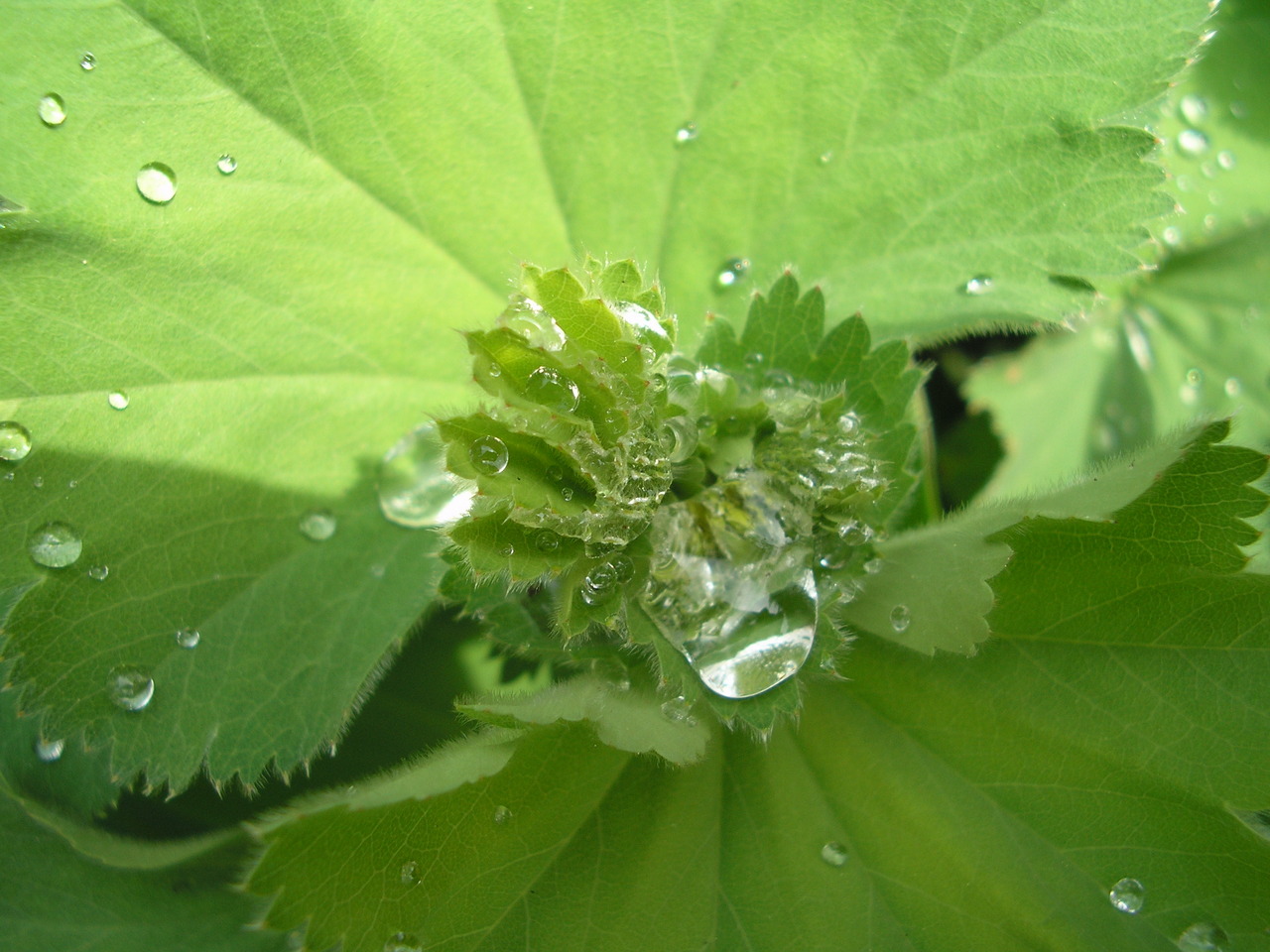 Regendruppels op bladeren van de alchemilla mollis plant.