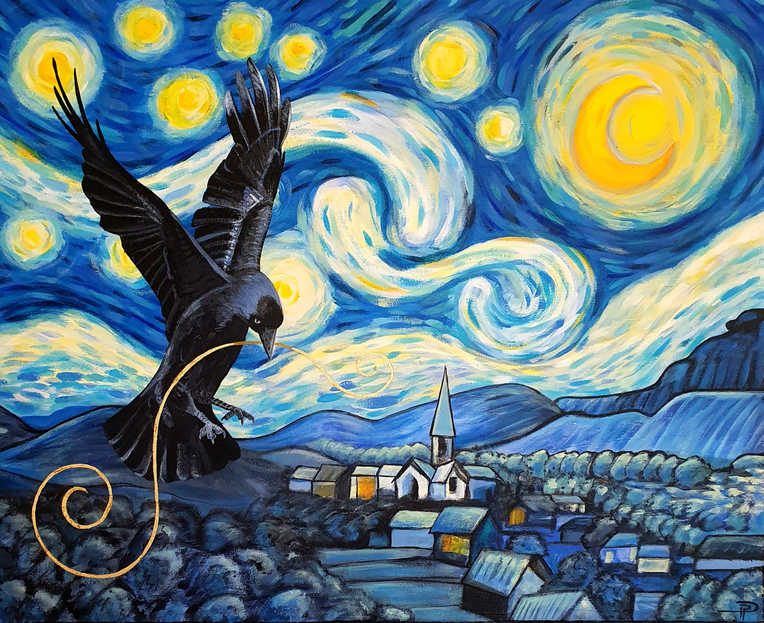 Daar het originele schilderij een abstract landschap heeft, werd ik geinspireed om daar een kauw met een gouden draad er doorheen te laten fladderen