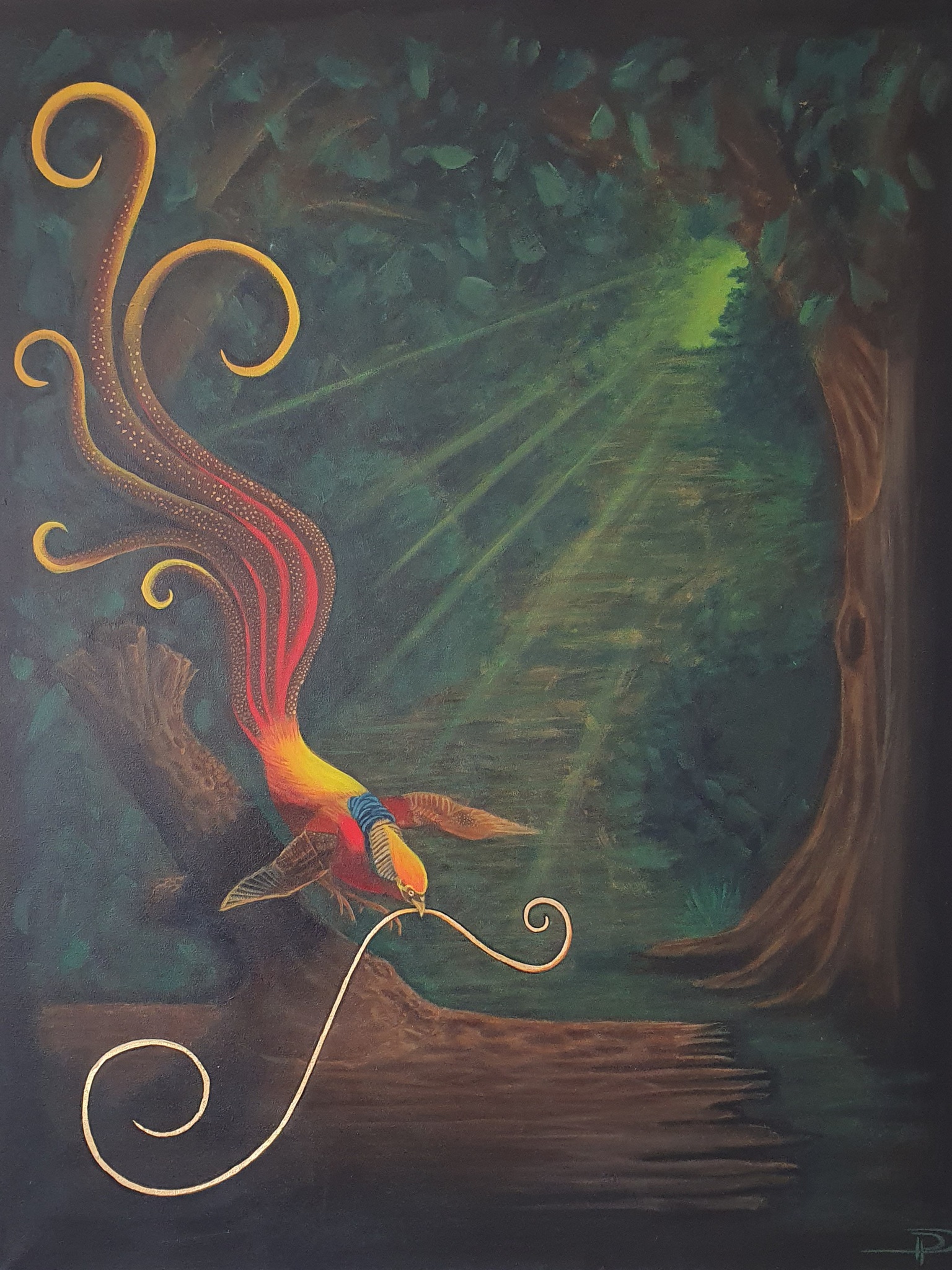 de gouden Fazant schittert temidden van een duister woud, doordat hij de gouden draad vasthoudt, dat Gods liefde symboliseert Psalm 23:4 Ook al ga ik door een dal van diepe duisternis, ik vrees geen kwaad want U bent met mij