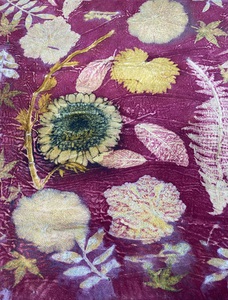 Deze geitenleren lap heb ik geverfd met plum Landscape verf. Bloemen en bladeren uit eigen tuin.