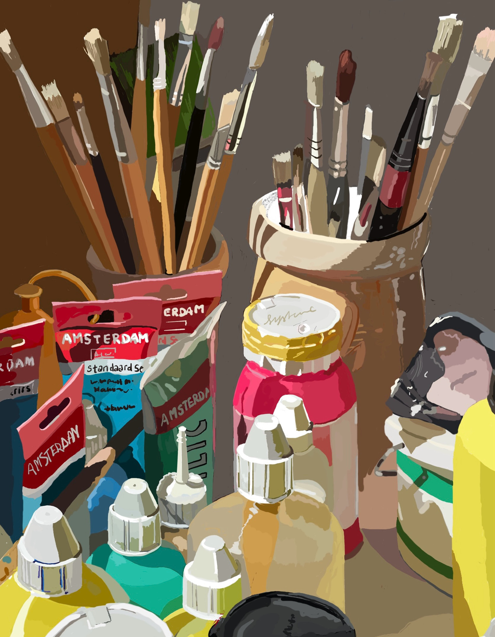Atelier Verf Flessen Kwast Penseel Rood Oranje Roze Geel Blauw Groen Wit Bruin Schilderij Schilderen Werkplek Ezel Schildersezel Potten Tube