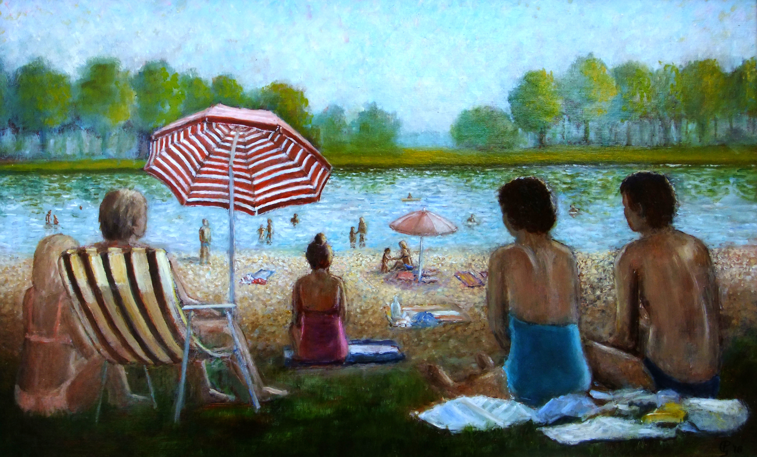 Mensen zonnebadend bij de Hoornse Plas in Groningen