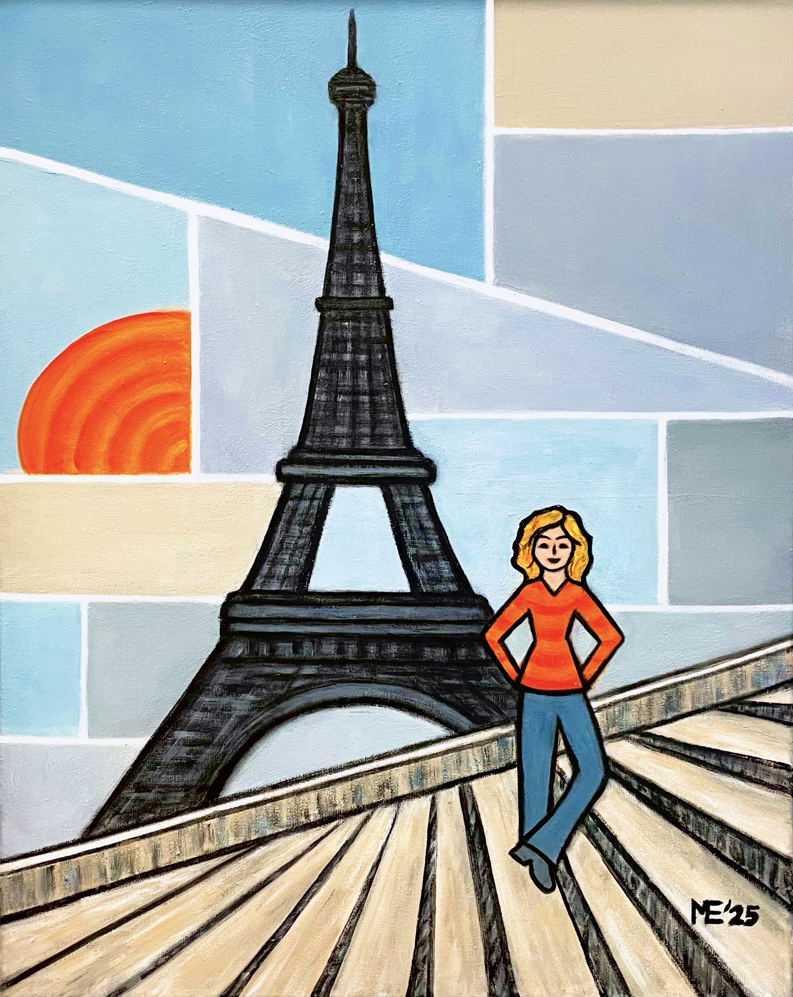 Tweede schilderij van een poserende dame bij de Eiffeltoren. Fantasievol, ontspannen en vrolijk geheel in een grafische, vlakmatige, geometrische en toch ook heel gelaagde stijl.