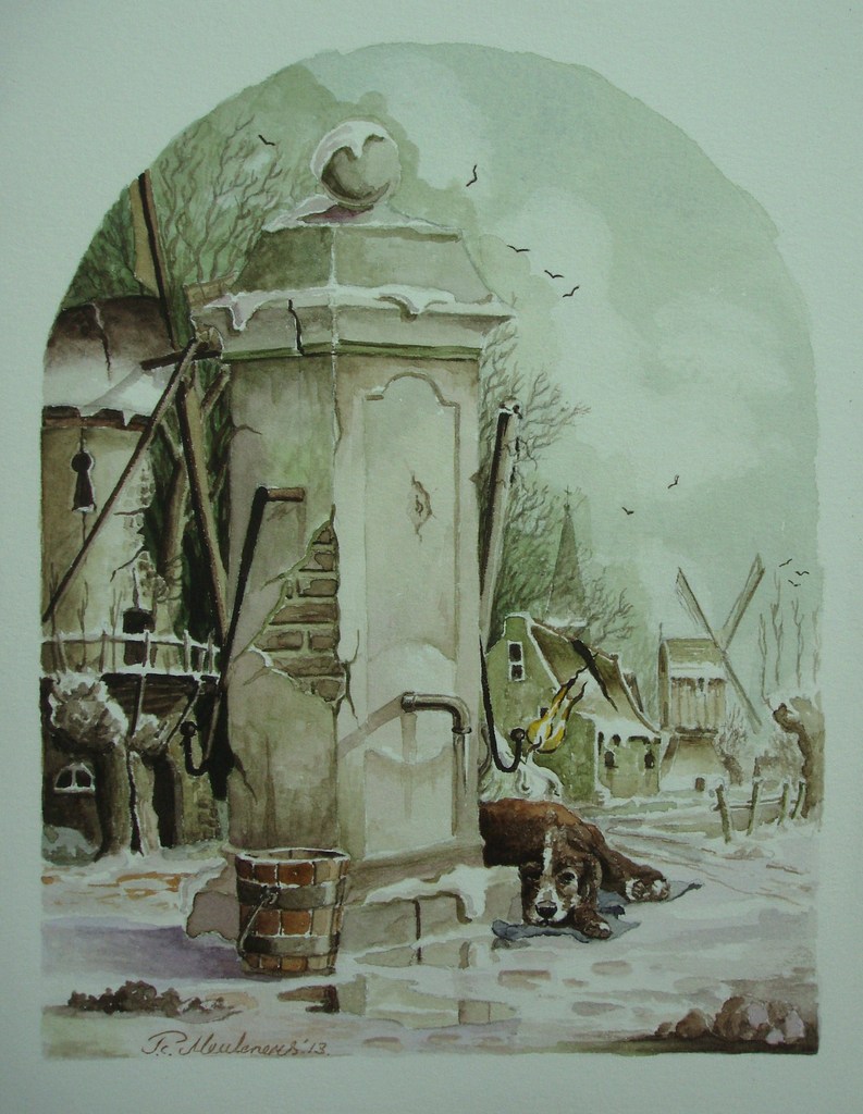 Landschap Romantiek Aquarel Winter Hond Realisme Fantasie Molen Kaars Kerst Kaart Waterpomp