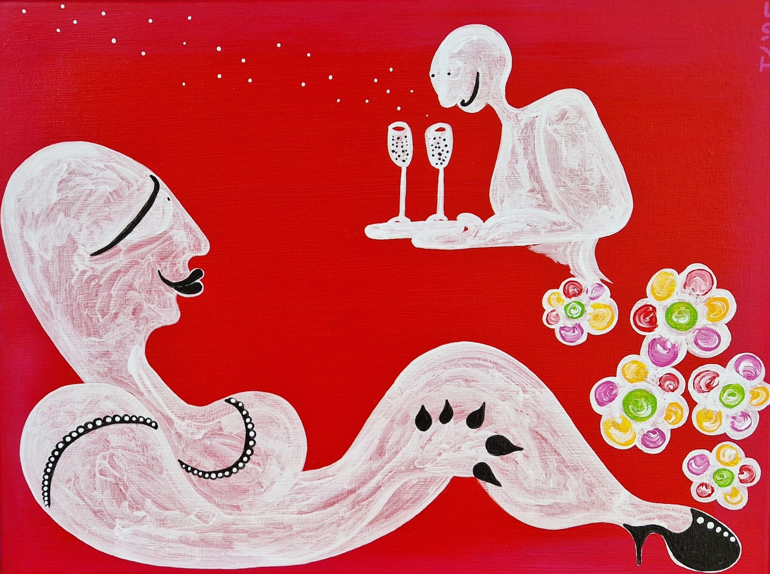 Acrylverf op doek, 30 bij 40 cm, in houten baklijst. De lijst is gekleurd en de afbeelding loopt gedeeltelijk door op de lijst. Dit werk is tot en met 17 juli 2025 te zien en te koop in de Leidse Stadtimmerwerf, prijs zie aldaar. Woensdag tot en met zondag van 11.00 tot 16.00 uur, Kort Galgewater 21 Leiden; van harte welkom!