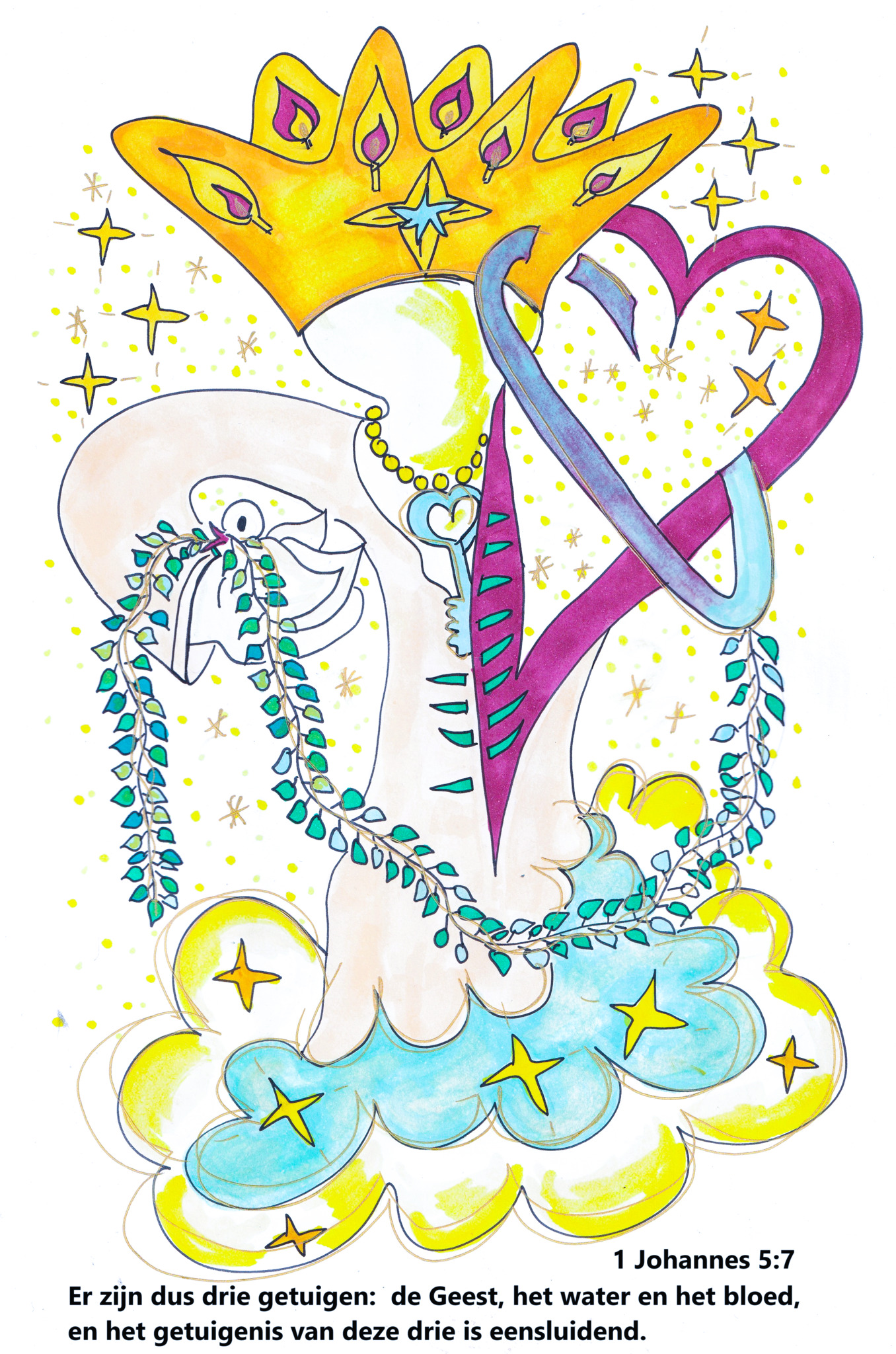 drie getuigen op aarde. uitbeelding van deze bijbeltekst 1 Johannes 5:7 Er zijn drie getuigen in de hemel: de Vader, het Woord en de Heilige Geest. En deze drie zeggen allemaal hetzelfde.