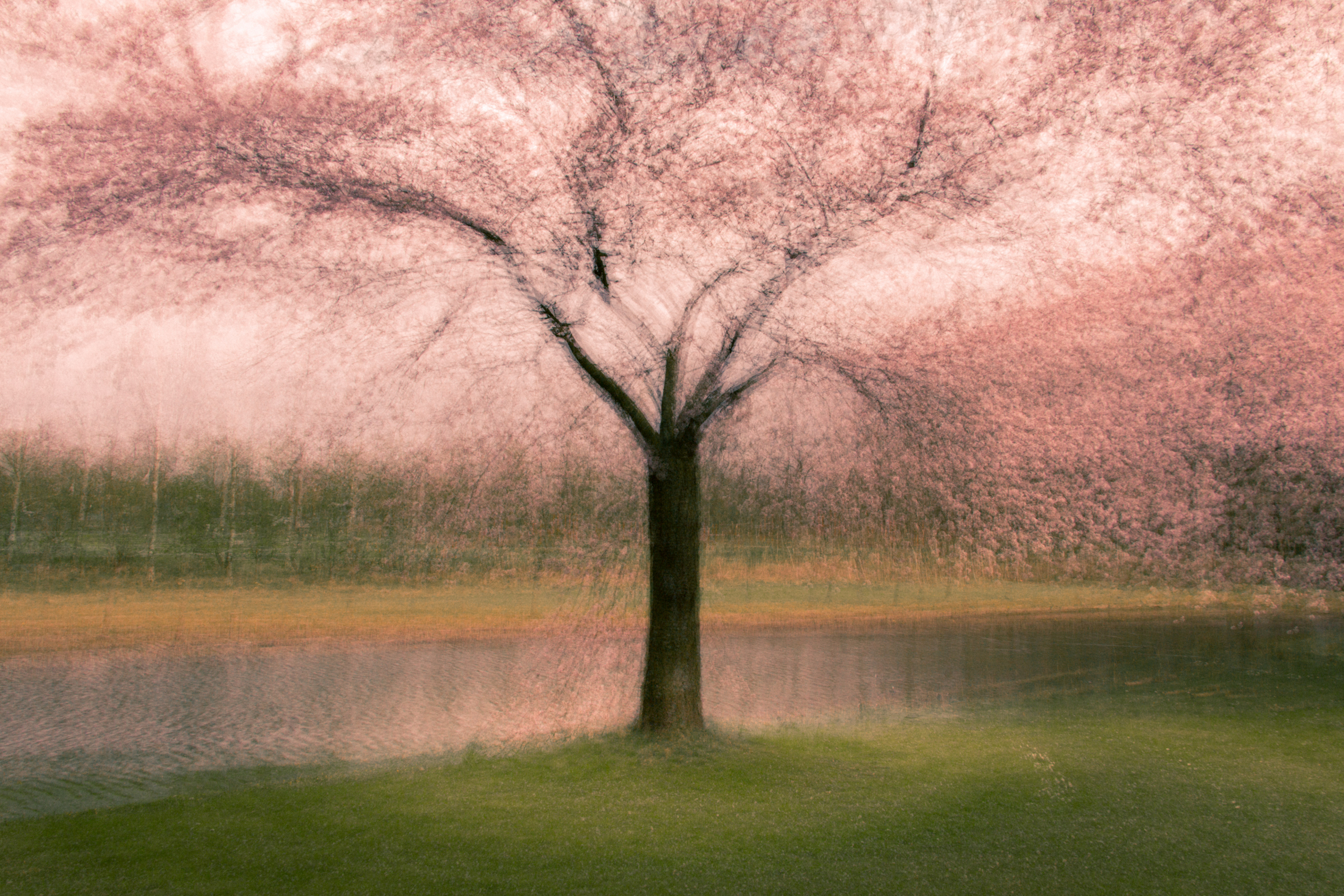 Impressionistisch beeld van een bloeiende boom (Kersenbloesem) op schilderachtige wijze weergegeven. De foto is hoofdzakelijk roze en groen van kleur. De foto is gemaakt met de zogenaamde meervoudige belichtingstechniek.