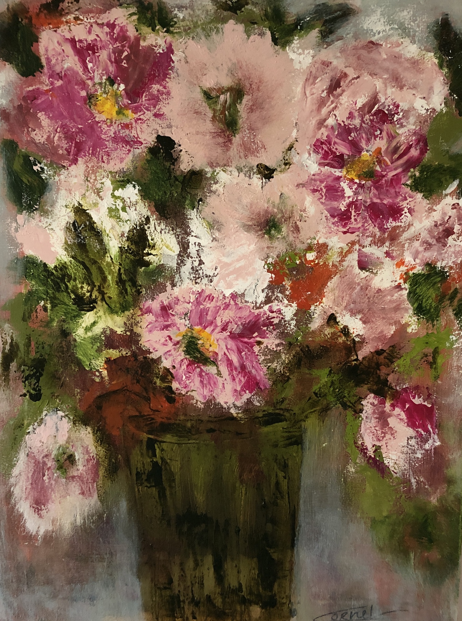 Cornel werkt graag op grote doeken. Bij de vrouwfiguren zijn niet altijd gelaatstrekken geschilderd, het zijn anonieme figuren. Schilderijen hebben hun bestemming gevonden in binnen- en buitenland.