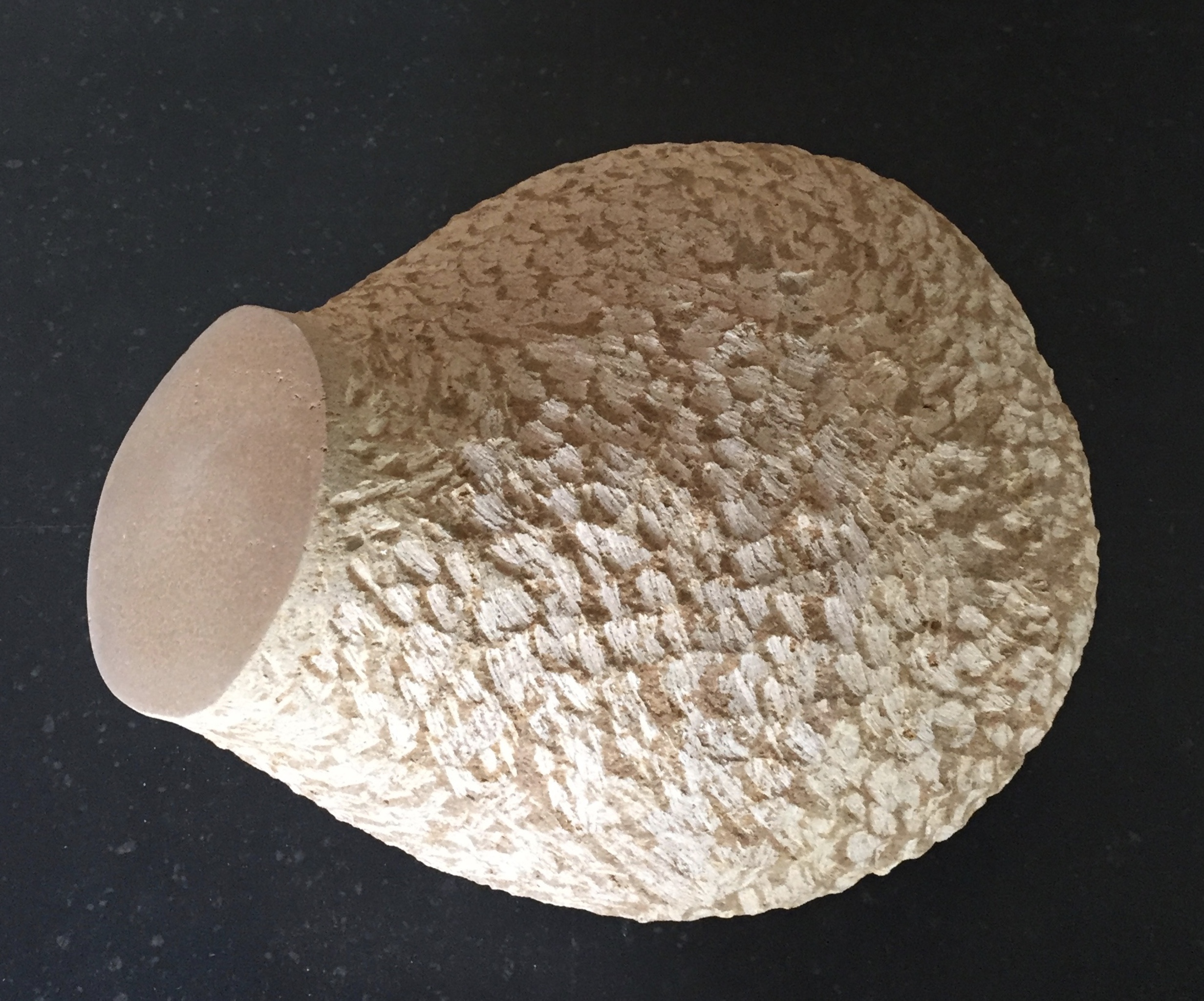 Het is een merkwaardig beeld. Qua vorm zou het zo maar ergens in het lijf te vinden zijn, maar de oppervalkte maakt het weer onmogelijk. De schubben zijn gehakt met een rondeeltje. Het werk is gemaakt van aragoniet.