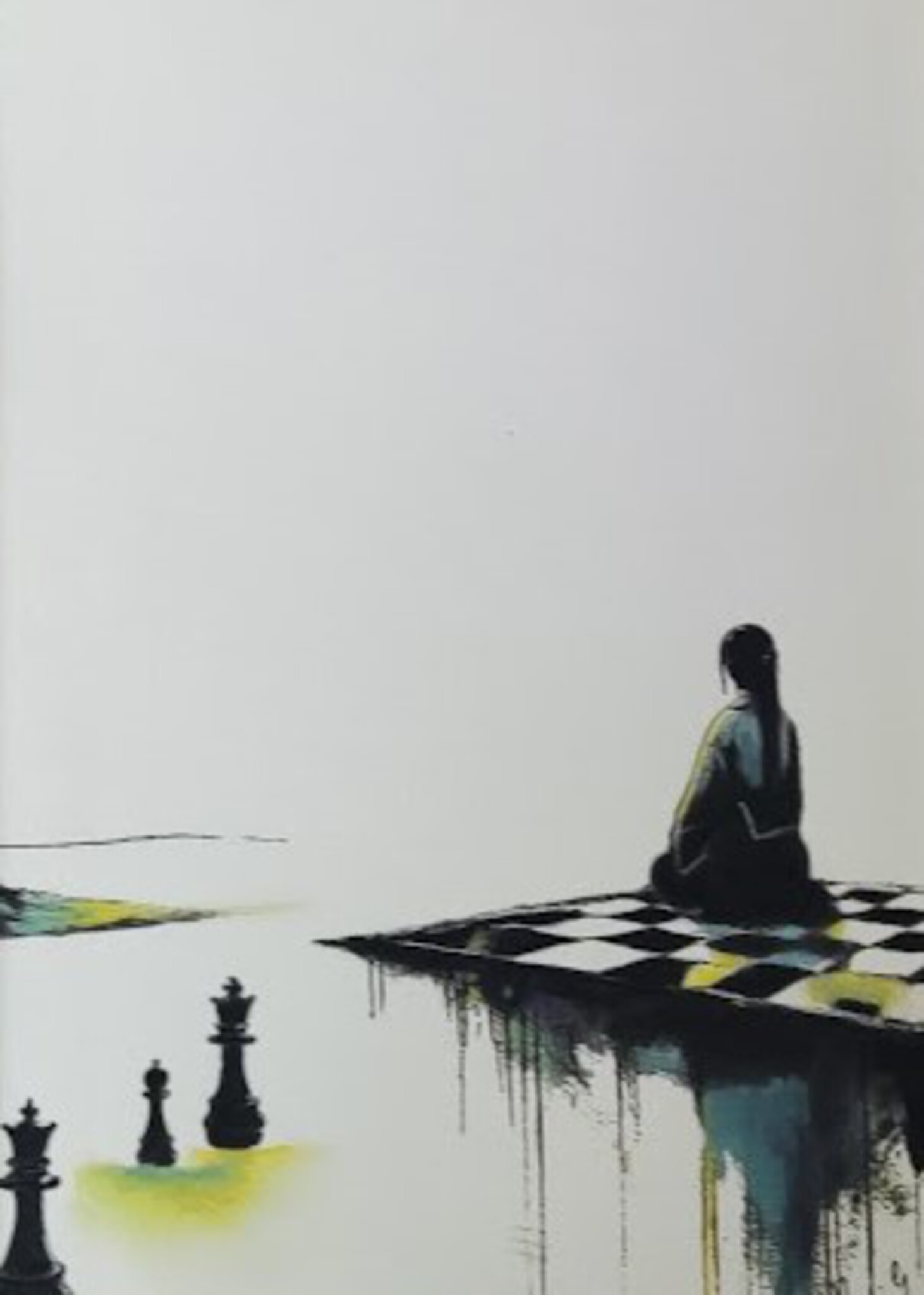 Een vrouw zit stil op een zwevend schaakbord dat lijkt te vervagen aan de randen. Voor haar staan enkele schaakstukken op een wit vlak met subtiele gele en groene tinten. Het werk ademt stilte en reflectie, met veel leegte rondom, waardoor een gevoel van tijdloosheid en contemplatie ontstaat. De verf lijkt hier en daar te druipen, wat een dromerig en licht surrealistisch effect geeft. Dit is een handingekleurde print ontworpen en ingekleurd door Martine Jacobs