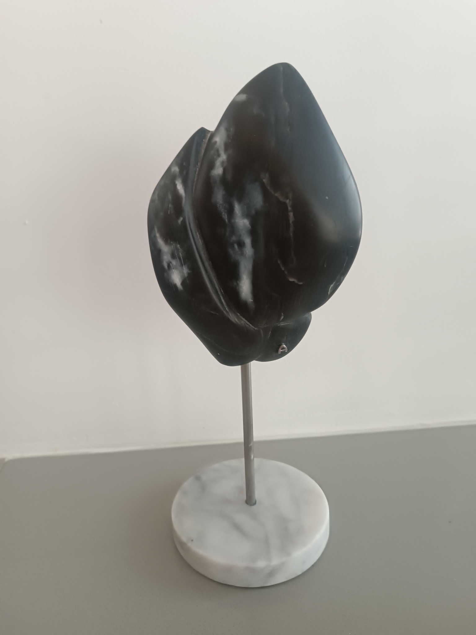 Tulp zwart met wit van Speksteen op grijze ronde sokkel