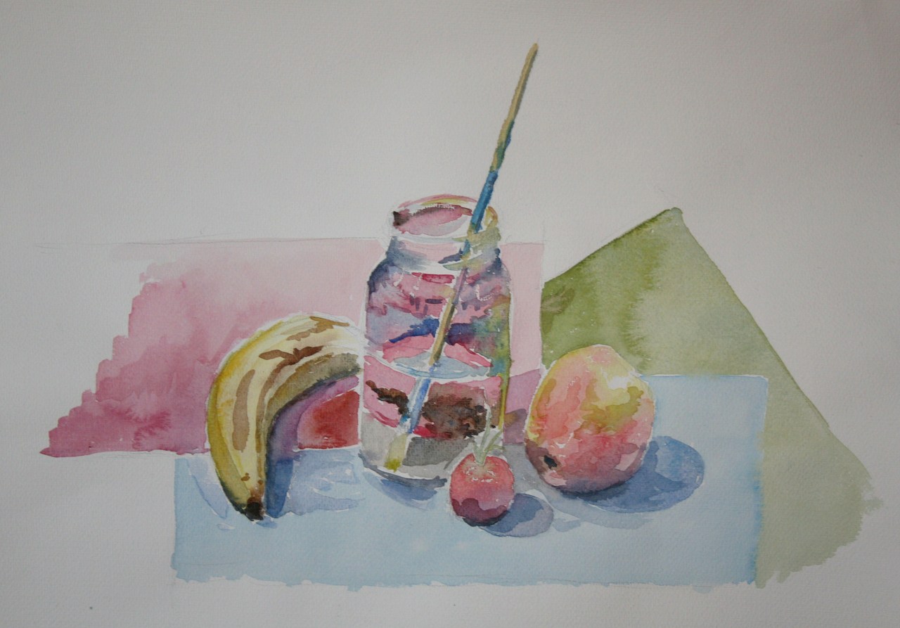 aquarel van fruit, glazen potje en gekleurd papier - naar waarneming geschilderd