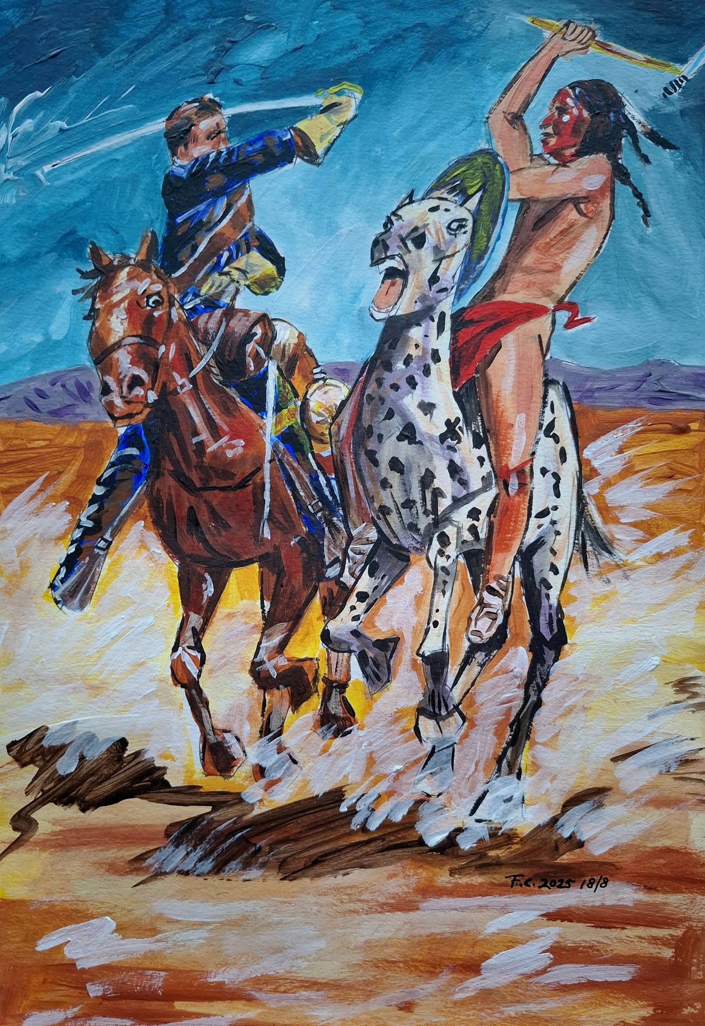 Vrij naar voorbeeld. Duel tussen indiaan en millitair.