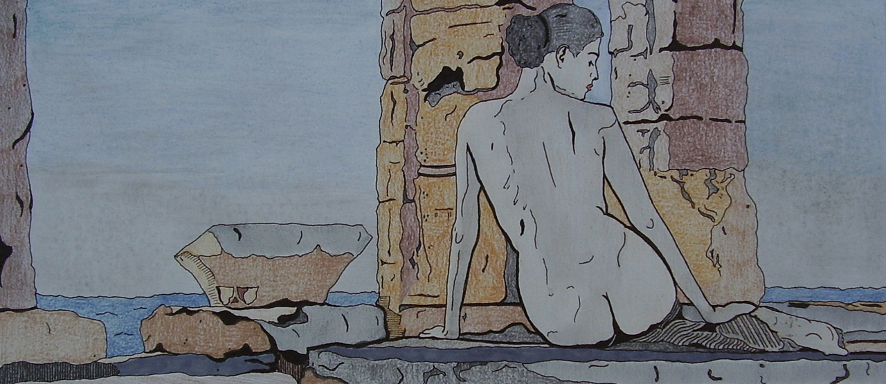 Tekening van naakte vrouw op de rug gezien potlood, inkt A3 formaat