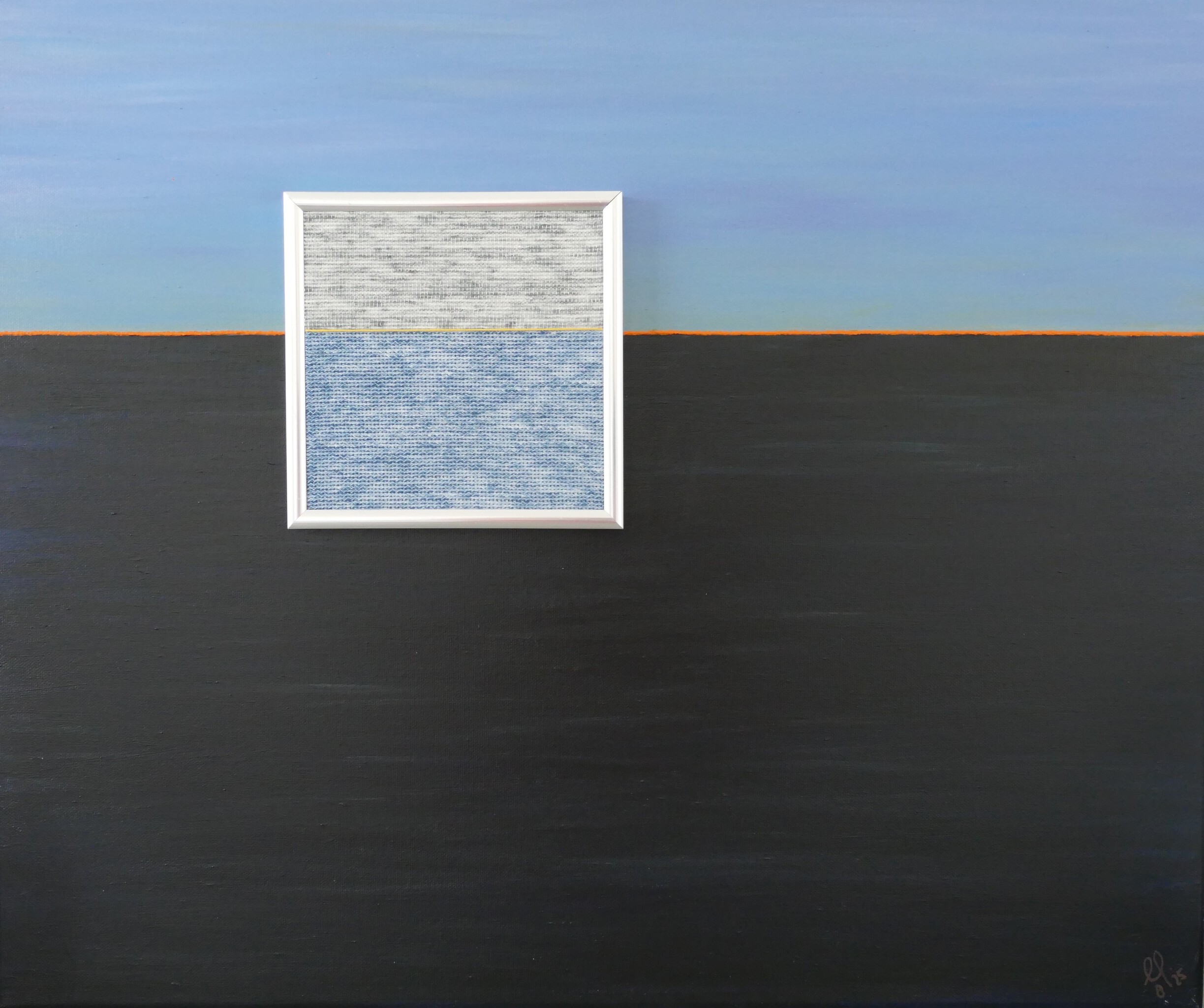 Het doek is met diverse lagen acrylverf bewerkt. In het vierkante raamwerk is een borduurwerk opgenomen. De kleuren en horizonlijn verbinden het geheel. Het is een variant op kunstwerk mixedmedia 36.