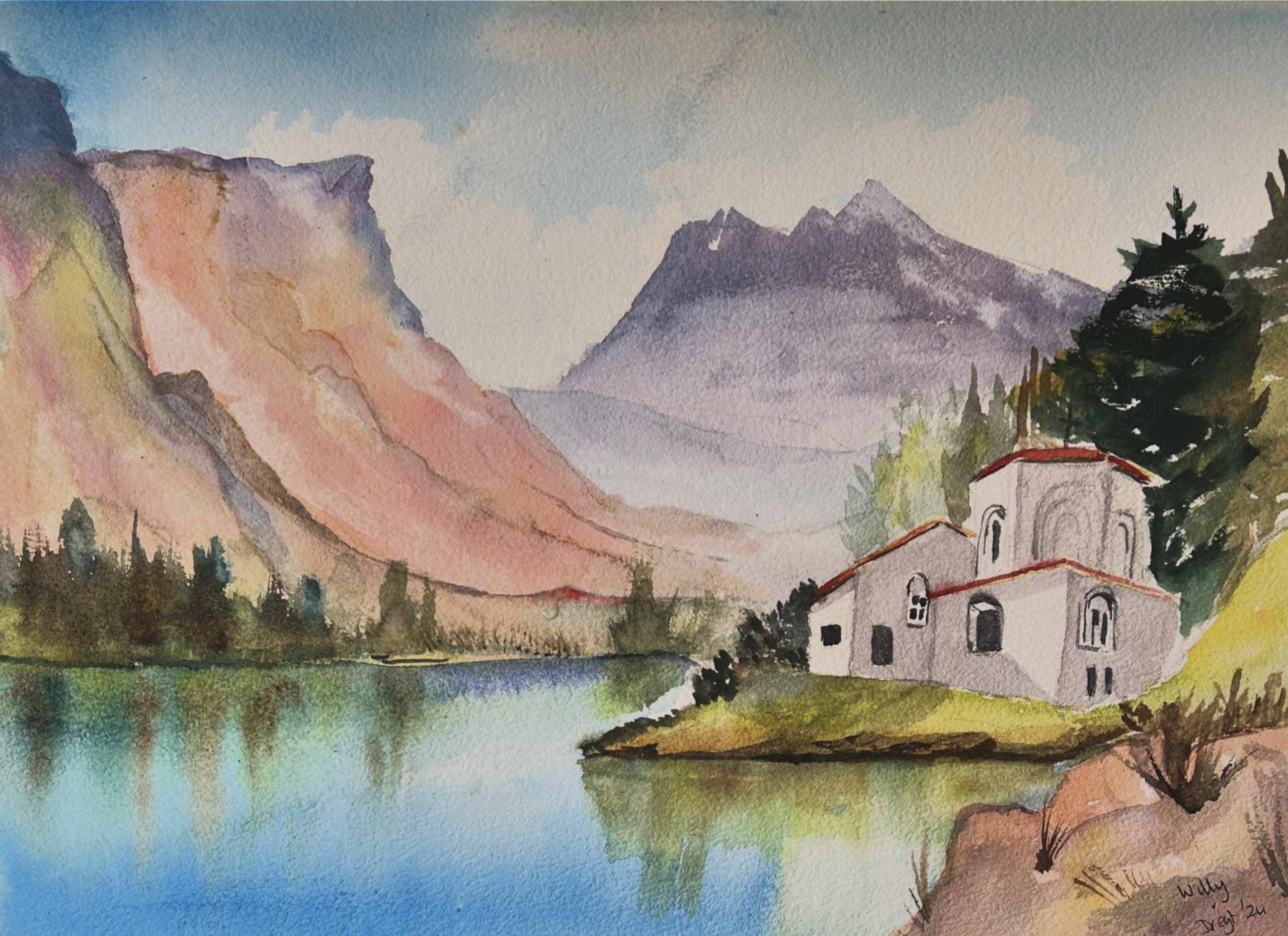 Landschap Aquarel Natuur Kerk Schoonheid Reflectie Rust Waterverf