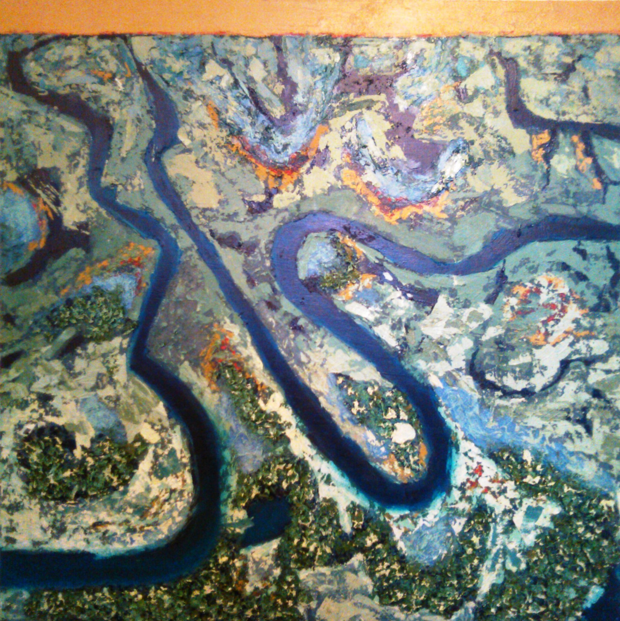 Het schilderij is een abstracte weergave van het Biesbosch-landschap. De toevoeging van zand en zaagsel geeft een organische textuur, die de aarde en het water van het gebied oproept. De kleuren variëren van koele blauwtinten tot warme aardetinten, wat de diversiteit van het landschap weerspiegelt.