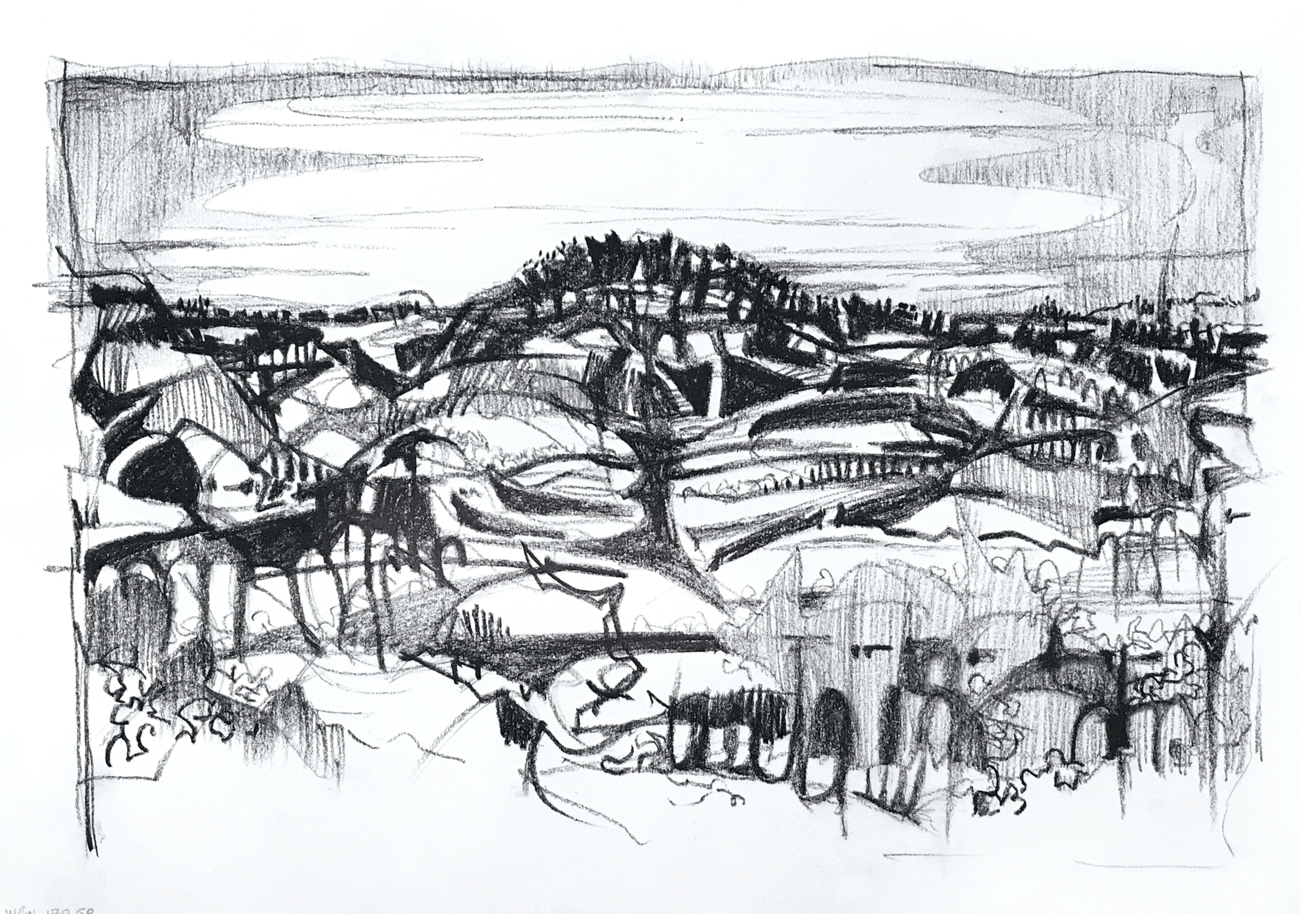 Siberisch krijt op 220 gr papier , 27 x 40 cm. De tekening wordt zonder afsnijding in een passe-partout ingelijst.