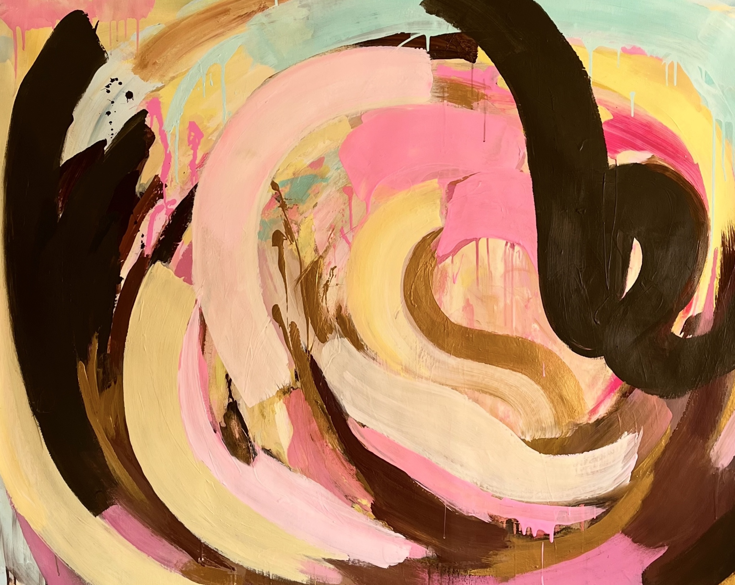 Wat er al zo lang verscholen zit onder de oppervlakte, mag nu het daglicht zien. Met stevige kwaststreken en expressieve verfspatten en hier en daar een tikkie goud! Dit doek is niet opgespannen, maar dat kan natuurlijk geregeld worden!
