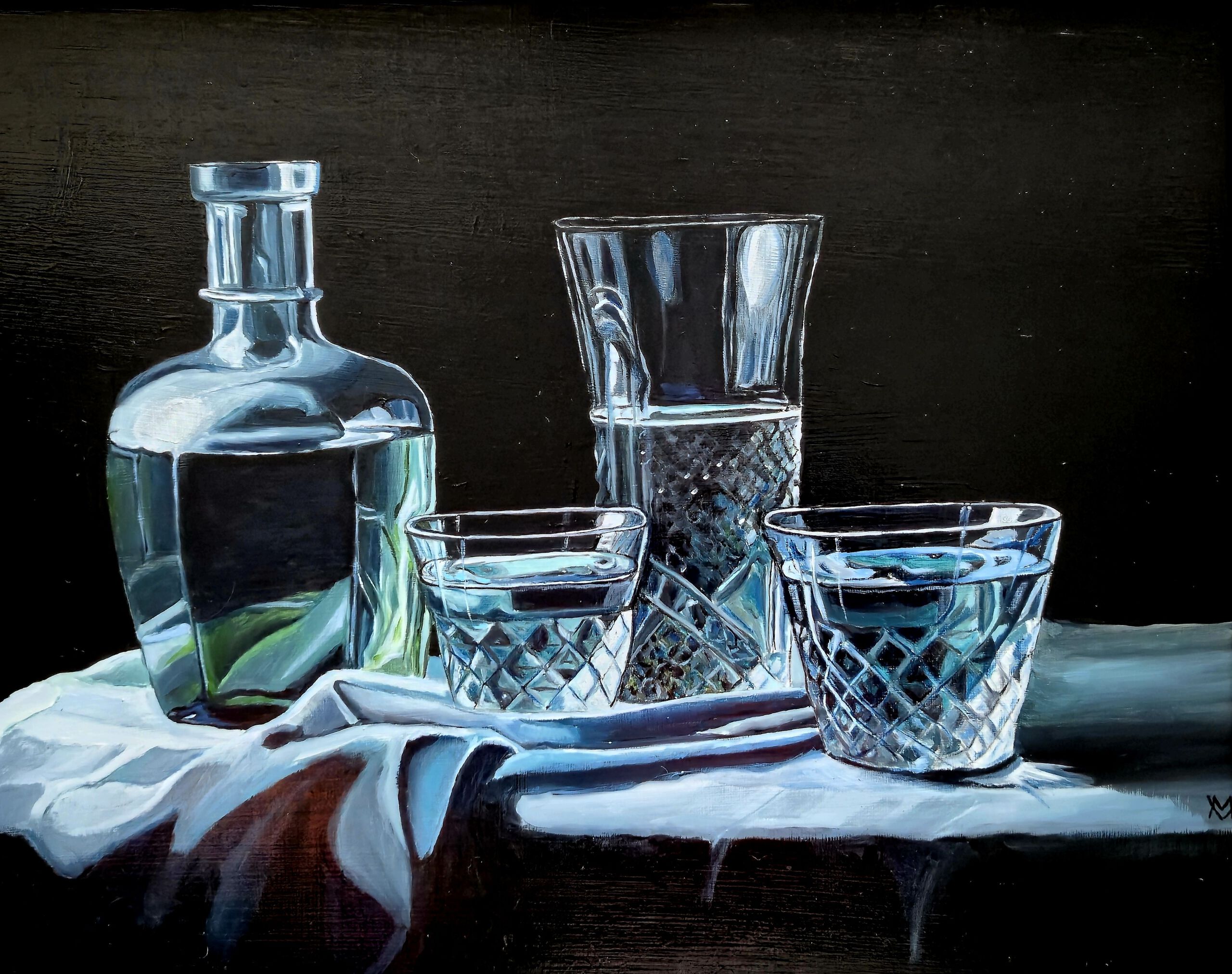 Kristal glaswerk op kleed tegen een donkere achtergrond