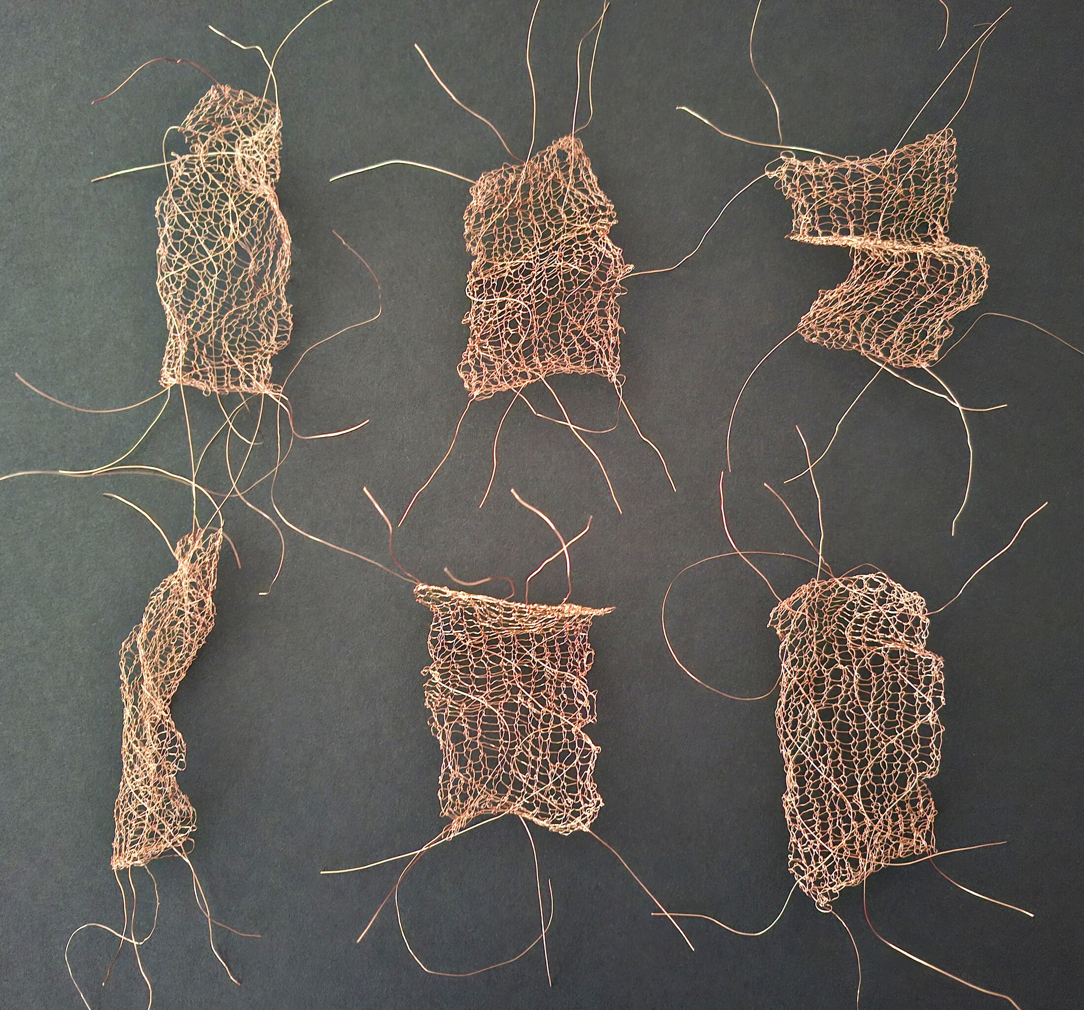 Breien met heel dun koperdraad is een apart verhaal. Deze zes miniatuur breiwerkjes zijn transparant en zeer buigzaam. Ze nodigen uit om zelf in een vorm te buigen en deze vorm naar believen weer te veranderen.