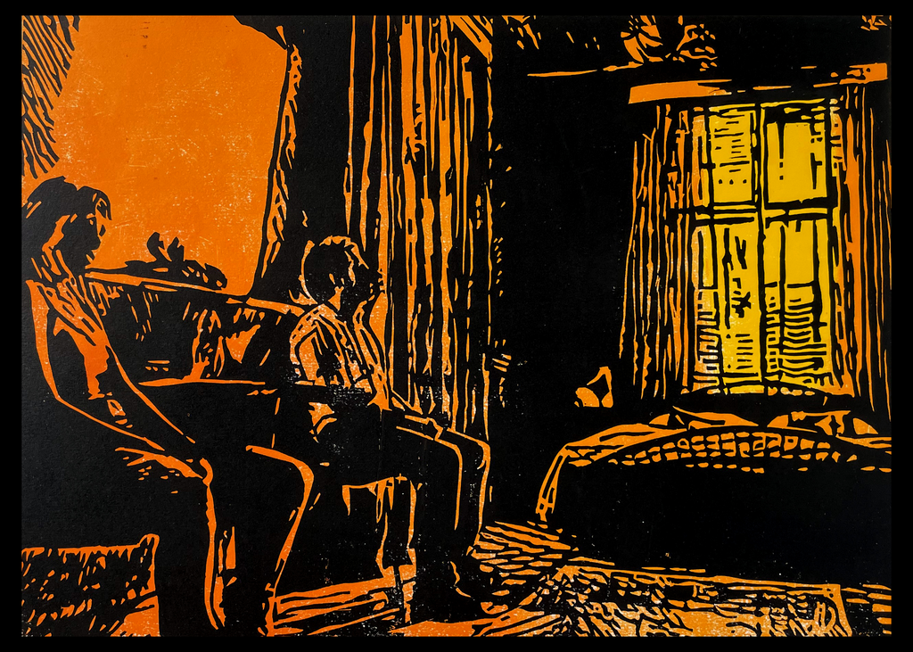 Ik ben linokunstenaar in Gorssel. Mensen in interactie inspireren me. Ik kies beelden van straat, theater en film. Foto’s helpen me om scherp te kijken, tot keuzes te komen.