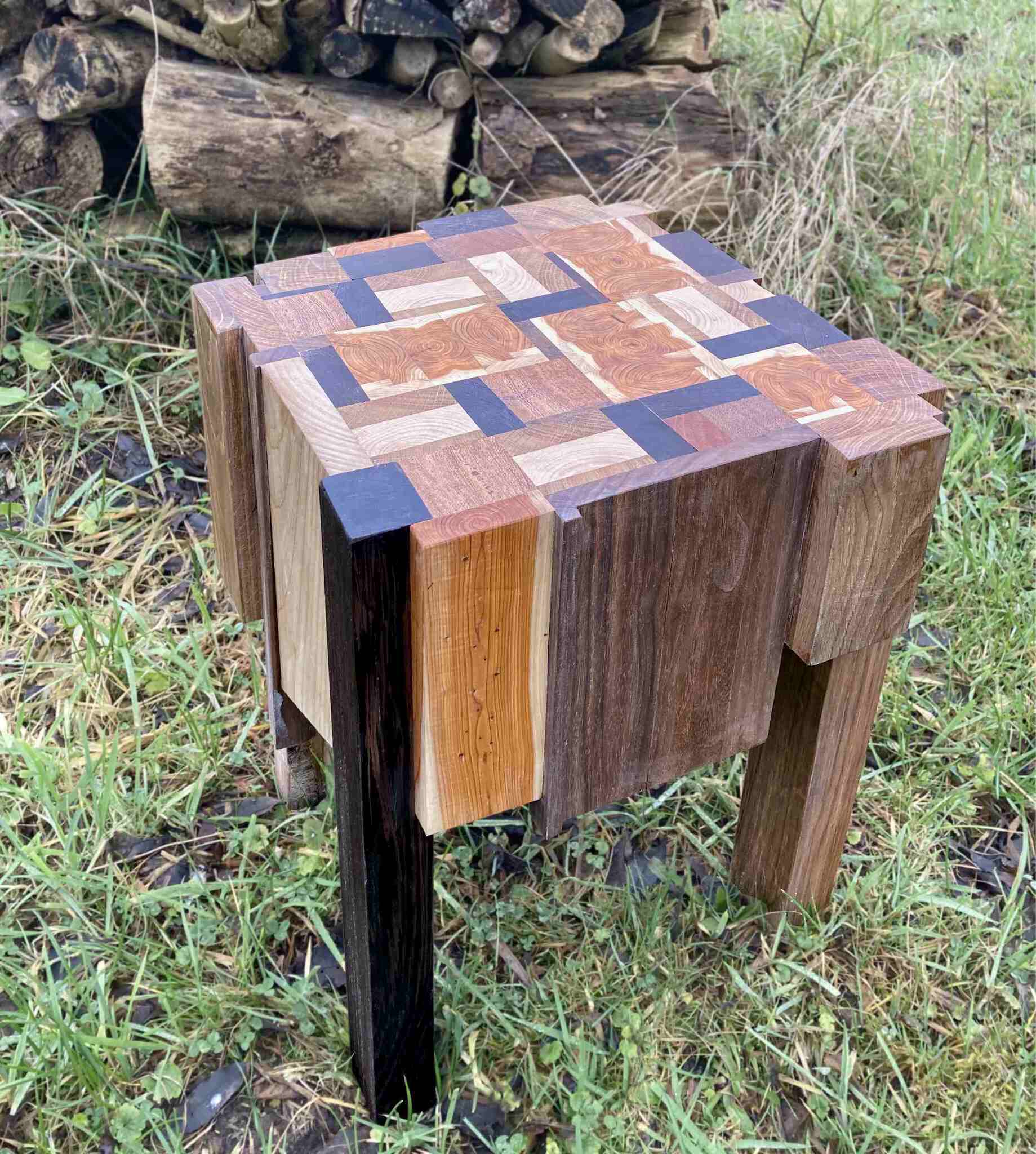 Het oranje van het taxushout knalt eruit op dit tafelblad. De ongelijke lengtes aan de zijkant dragen bij aan het speelse karakter. De gehele tafel is van resthout gemaakt. Houtsoorten: taxus | wengé | eiken | essen | onbekend tropisch hardhout| Afmetingen L30 x B31x H45 Afgewerkt met white wash en hard-wax olie