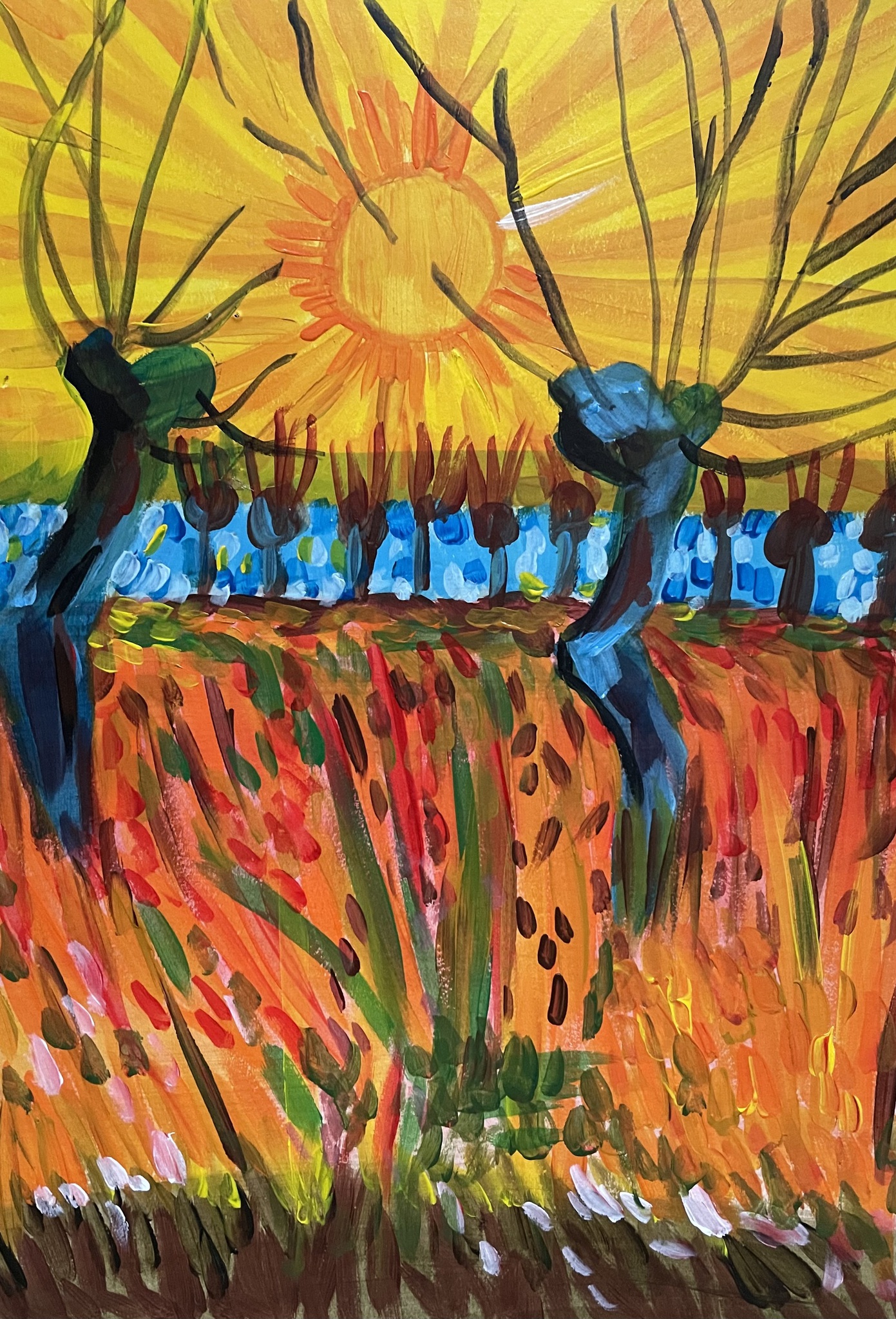 Een impressie van 1 van de werken van Vincent van Gogh. Het is een klein stuk uit een werk van Vincent. Vooral omdat de kleuren van Vincent mij aanspreken. Het is geschilderd op papier wat is geplakt op een houten paneel.