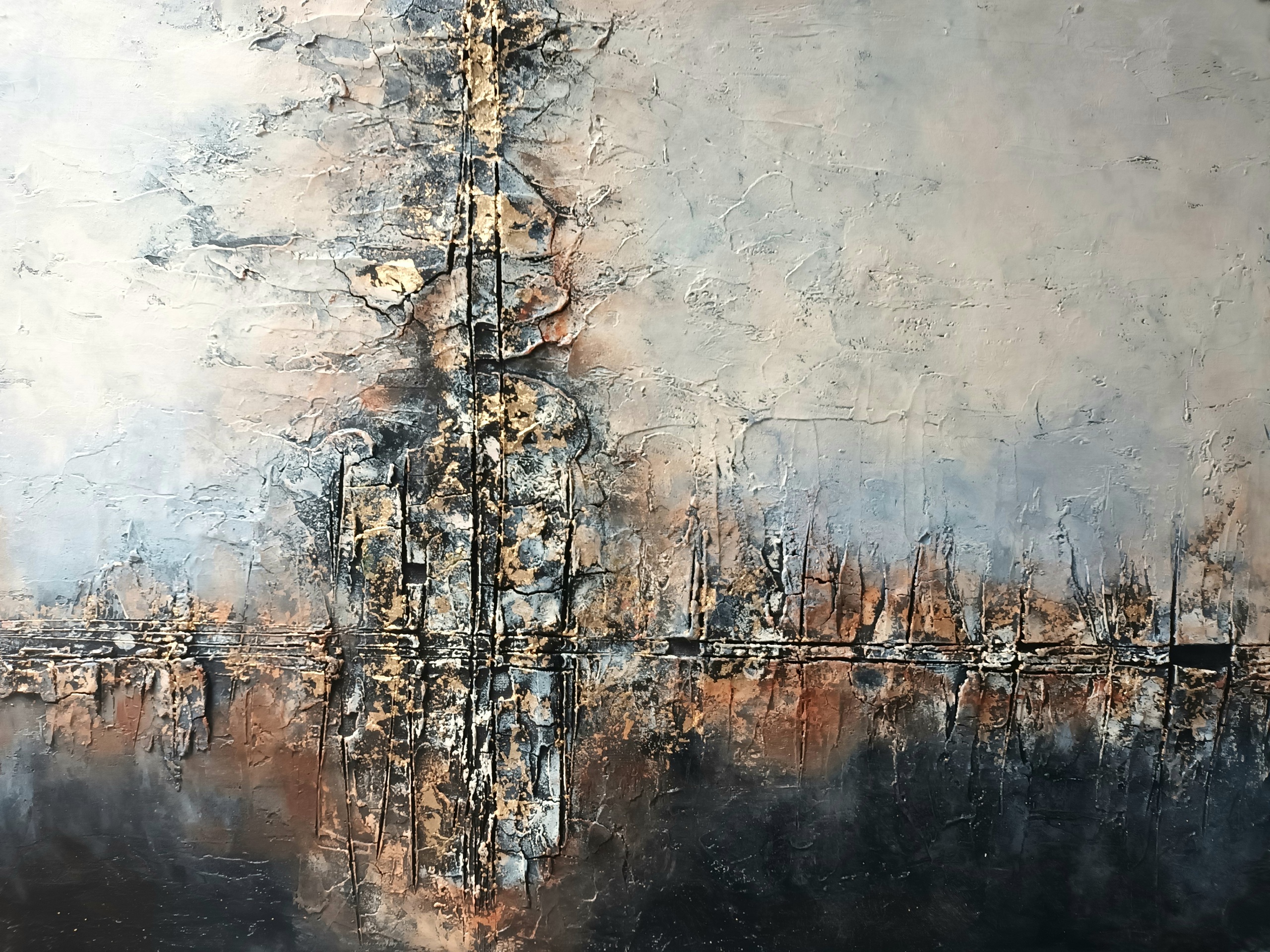 Abstract Grijs Zwart Acryl Goud Doek Op Pasta Ecru Craquelé