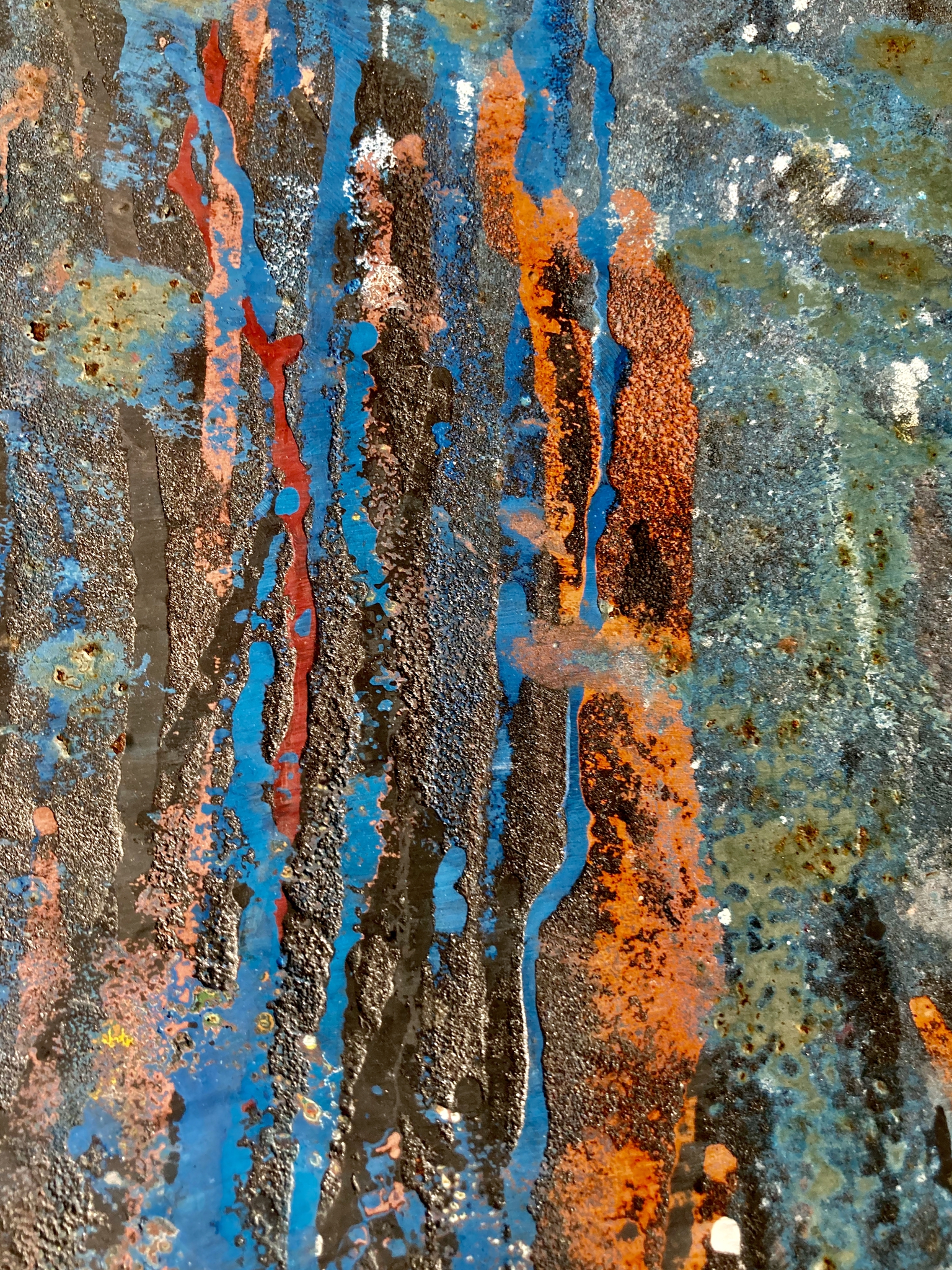Bij een wandeling zag ik deze schram op een karretje dat gebruikt werd bij een terras van een cafe-restaurant bij mij in de buurt. Bescheiden omdat je hem bijna niet zag, terwijl hij toch al jaren bezig was zichzelf vorm te geven. Eenmaal thuis, na een beetje schoonmaken, schrok ik van de kleuren die er achterweg kwamen. Daarom is deze wel een van mijn favorieten.