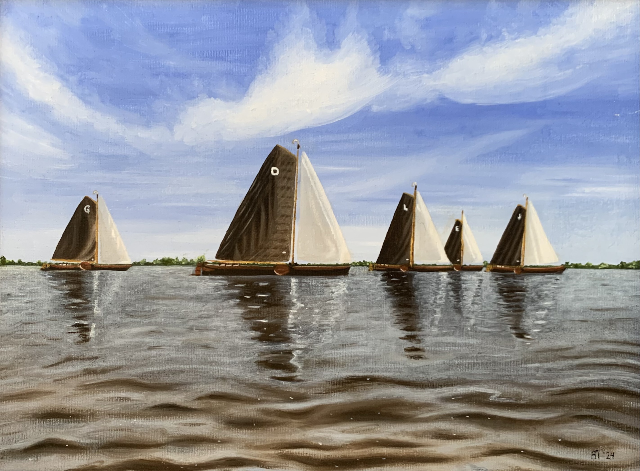 Dit olieverfschilderij op doek (45x35 cm) toont een vloot van traditionele Friese skûtsjes die in strakke formatie over het water glijden. De boten, met hun kenmerkende donkere zeilen en witte voorzeilen, weerspiegelen elegant in het zacht bewegende wateroppervlak. De heldere blauwe lucht met sierlijke wolkenpartijen geeft het tafereel een gevoel van rust en ruimte. Een eerbetoon aan de Nederlandse zeilcultuur en de schoonheid van samenspel tussen natuur, traditie en techniek.