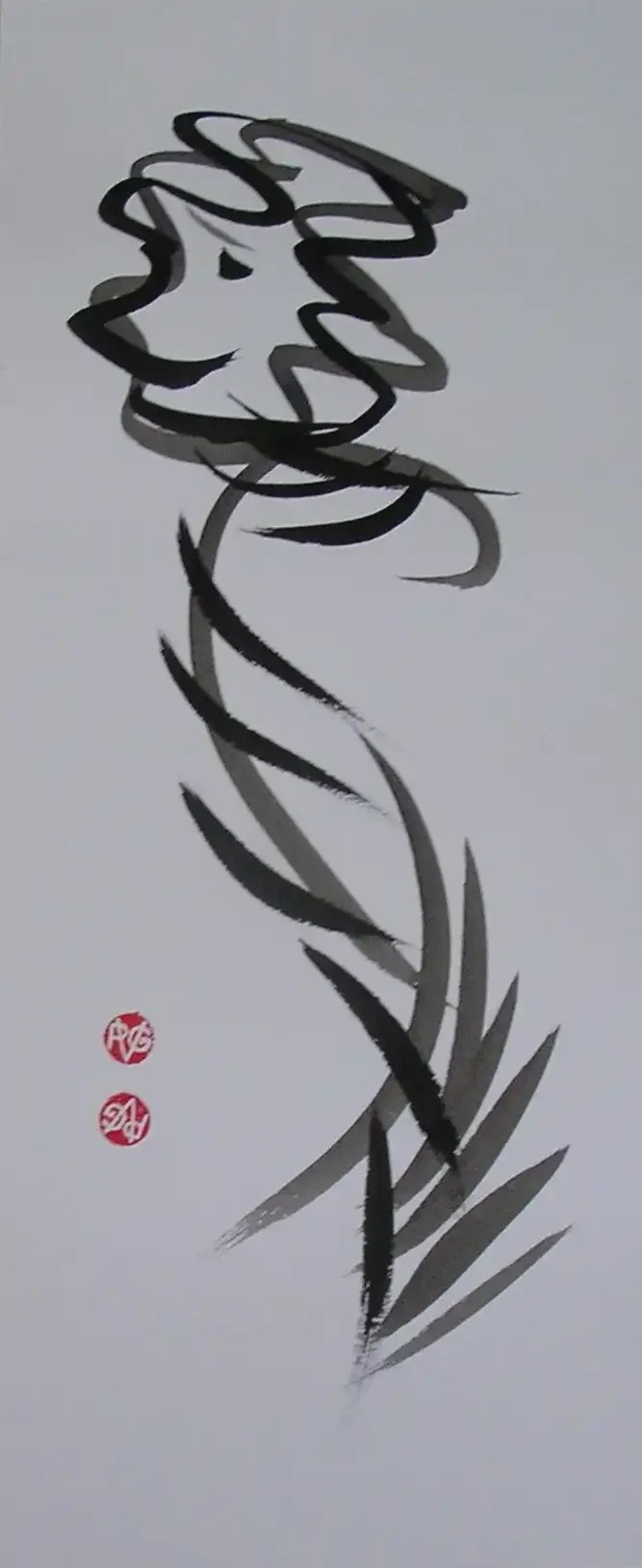 Sumi E is een techniek van kalligrafie die ik probeer te integreren in mijn vormentaal.