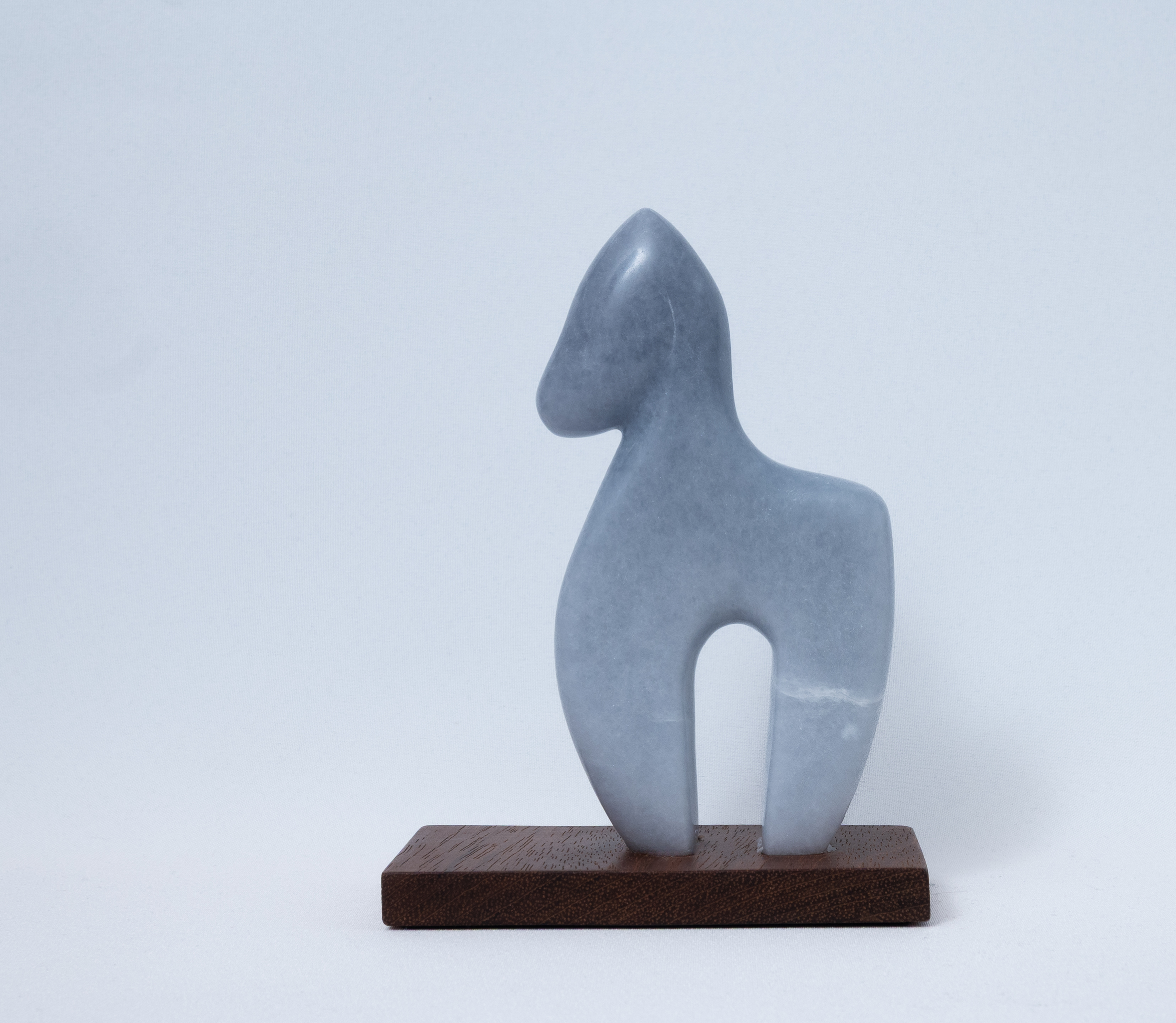 Aiyanar paard van blauwe albast op houten sokkel.