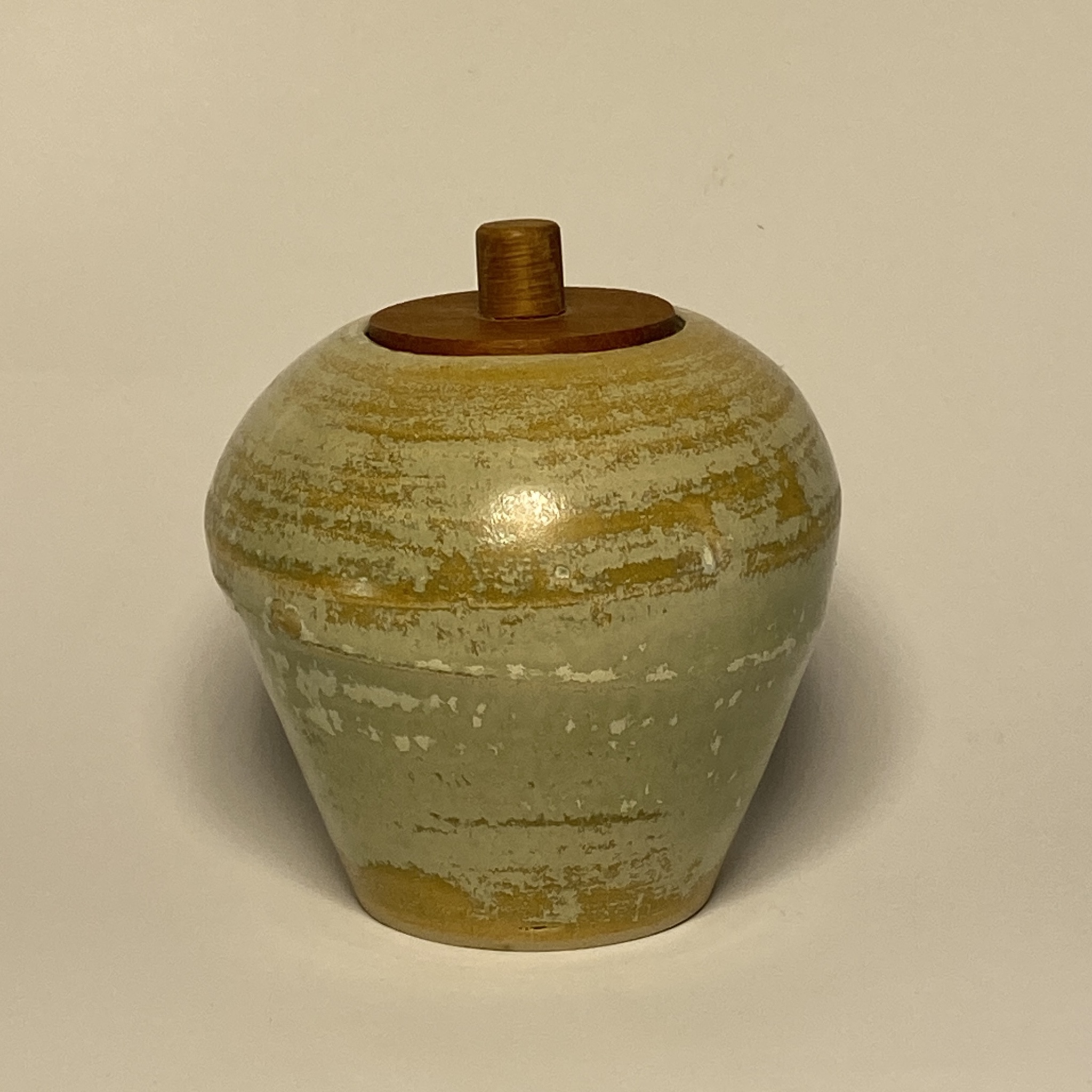Groen-bruin vaasje (hoogte 11 cm) met teak dekseltje, gestookt op 1240 C en voorzien van deksel met knop.