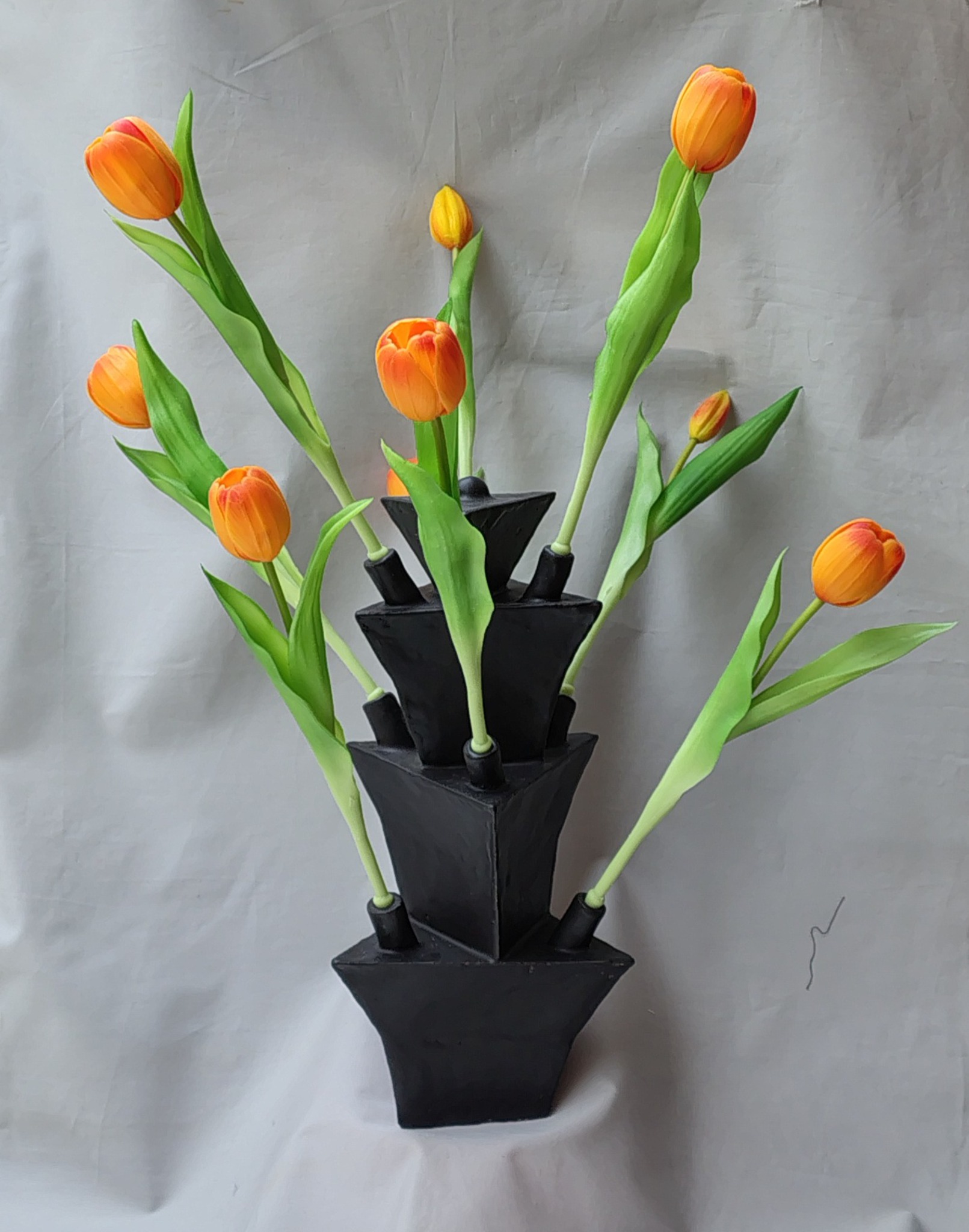 Van plaatjes klei heb ik een tulpenvaas in elkaar gezet. Door de afwerking met matte zwarte glazuur ziet het er strak uit. De tulpen zijn van plastic, volgnens mij kun je zo'n vaas niet goed schoon houden als je er echte tulpen in zet